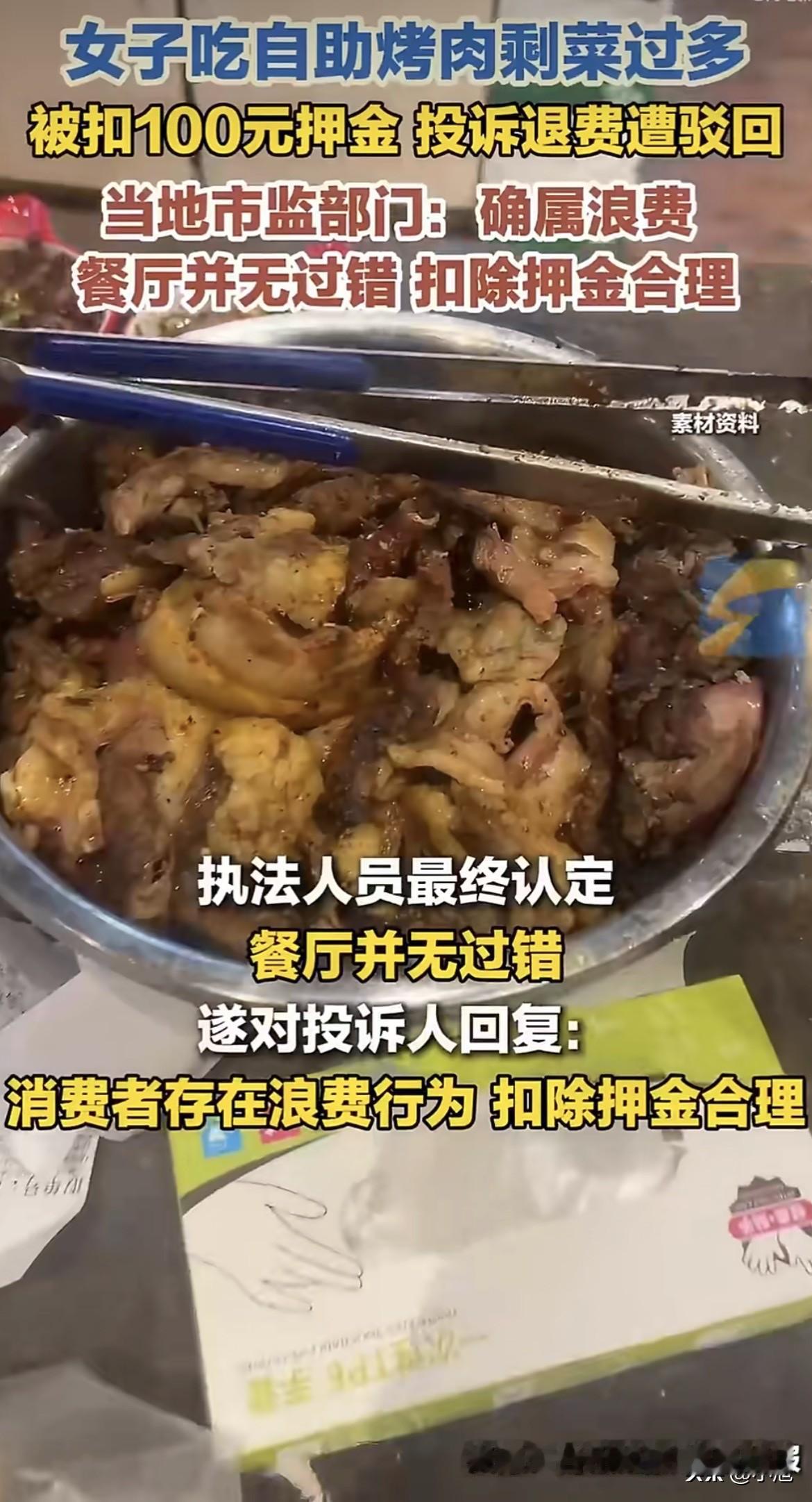 反转来得太快!吃自助剩菜被扣100元押金,女子投诉反被市监部门驳回。 事情发生在湖北襄阳。一位女子去吃自助烤肉,临走时桌上还剩400多克食物。餐厅按规矩扣了她100元押金。女子觉得委屈,转头向市场监管部门投诉,要求退钱。 没想到,执法人员调查后,态度很明确:支持餐厅扣钱。理由就一条——这属于明显的食品浪费。 押金这事,不少自助餐厅都有这规矩。进去吃之前,服务员常会提醒,或者直接在醒目位置贴出告示:浪费超过一定量,押金不退。这100元,就是防浪费的“紧箍咒”。 400多克食物,差不多是八两到一斤。有人可能没概念,换成常见的食物,比如五花肉片,大概就是满满两大盘还多。一边烤一边拿,眼大肚子小,最后吃不下了,盘子堆在那。 餐厅角度看,这规矩立了就得执行。要是今天对这位女士松了口,明天再有人浪费,管还是不管?规矩成了摆设,后面更难办。 市场监管部门这次没和稀泥。核实了情况,直接引用《反食品浪费法》撑腰。法律明确说了,餐饮服务经营者可以对造成明显浪费的消费者,收取处理厨余垃圾的相应费用。这押金,某种意义上就是“垃圾处理费”。 女子心里可能憋着气。钱不多,但觉得面子上过不去。或许当时想着“我花了钱就是顾客”,或者“实在吃不下了也不是故意”。但规定面前,这些理由都显得挺苍白。 网上搜搜,类似纠纷真不少。有些地方,顾客吵得天翻地覆最后报警;也有餐厅怕得罪人,最后妥协。但这次,监管给了个清晰态度:浪费,就是不行。 这事看似是100元的小纠纷,背后是两股劲在拉扯。一股是“我消费我随意”的旧习惯,另一股是“节约粮食、反对浪费”的新风气。以前很多人觉得,自助餐就是“饿得扶墙进,撑得扶墙出”,生怕吃亏。现在风气在变,吃多少拿多少,成了更被认可的文明做法。 餐厅做买卖,指望顾客多吃多拿多消费吗?未必。浪费的食物,最终是社会的成本,也是餐厅实在的损耗。押金这条规定,与其说是为了罚钱,不如说是一道提醒:量力而行,不够再取。 当然,规矩要让人心服口服,前提是得明明白白。告示是否足够醒目?服务员是否提前明确告知?称重是否公开公正?这些细节若做到位,争议会少很多。 眼下看,这次执法像颗小石子,投进了湖里。它告诉商家,依法设立的合理规矩,有人撑腰;也告诉消费者,时代的共识在移,以前习以为常的浪费,现在真可能让你付出代价。 以后进自助餐厅,你会更小心地掂量自己的胃口,还是觉得这规矩太不近人情?如果是你,会怎么选?