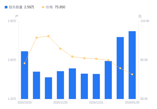 日期A股户数(户)流通A股户均持股数(股)户均持股市值(万元)2026-01-30259437171.6054.402026-01-20247327522.7660.032026-01-09198108188.8569.522025-12-31171449416.9980.812025-12-10172019385.7880.902025-11-28182918826.4676.972025-11-20177209110.8884.162025-11-10164589809.5098.472025-10-31176219162.0791.072025-10-20218057404.0361.44