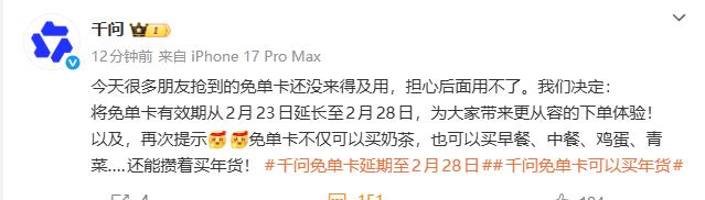 千问官方账号发文表示免单卡的有效期将从2月23日延长至2月28日,同时,千问也提醒广大用户,免单卡不仅可以买奶茶,也可以买早餐、中餐、鸡蛋、青菜等。