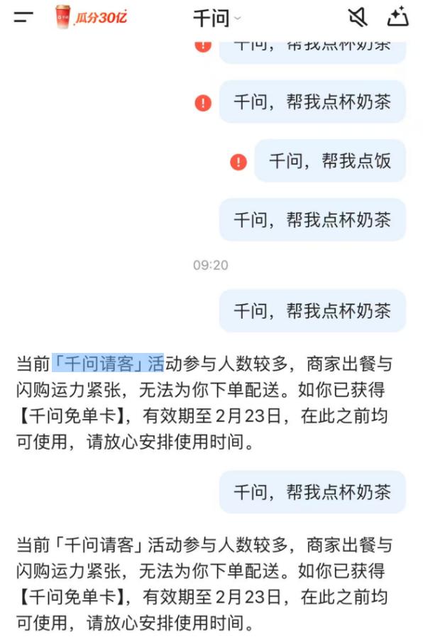 2月6日晚有网友发现,在千问APP中输入口令后会出现感叹号标识,不再跳转点单页面。通过向千问客服询问得知,免单卡每日发放有数量限制。“活动期间千问每日提供10000000张[千问免单卡],因为每日的免单卡数量有限,所以如果当天的免单卡已经发放完毕,用户就暂时无法获得了。不过别担心,平台会根据活动开展情况适当增加数量,当发放的免单卡和生活卡奖品总面额达到20亿元时,平台才会停止增加免单卡数量。”