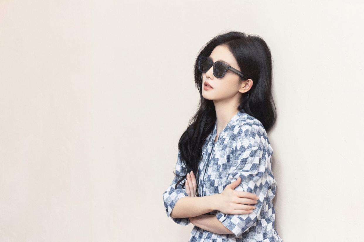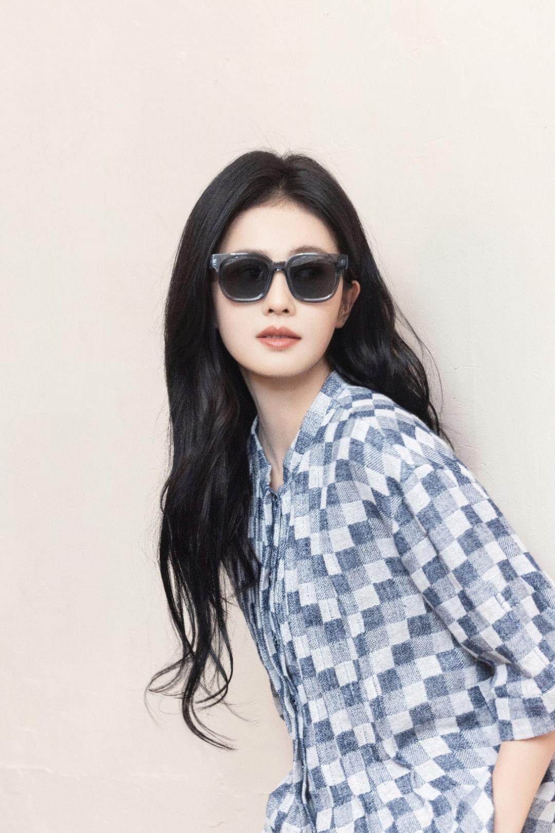 被白鹿这套蓝白格纹穿搭戳中了! 宽松套装慵懒舒适,黑长直秀发温柔飘逸,墨镜一戴又