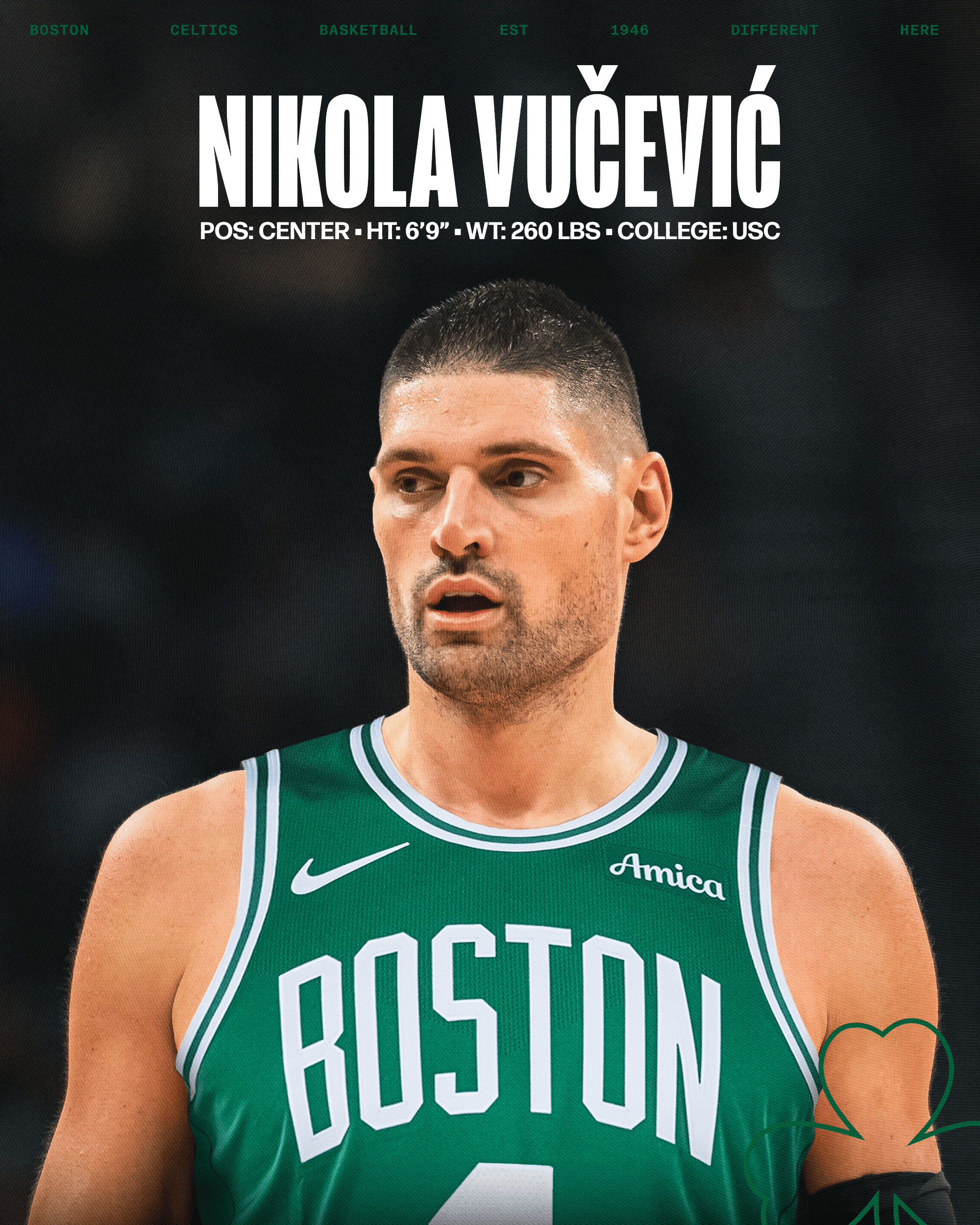 武切维奇加盟凯尔特人首秀拿到两双,武切维奇生涯第579次两双,现役球员中第二,仅次于詹姆斯612次。