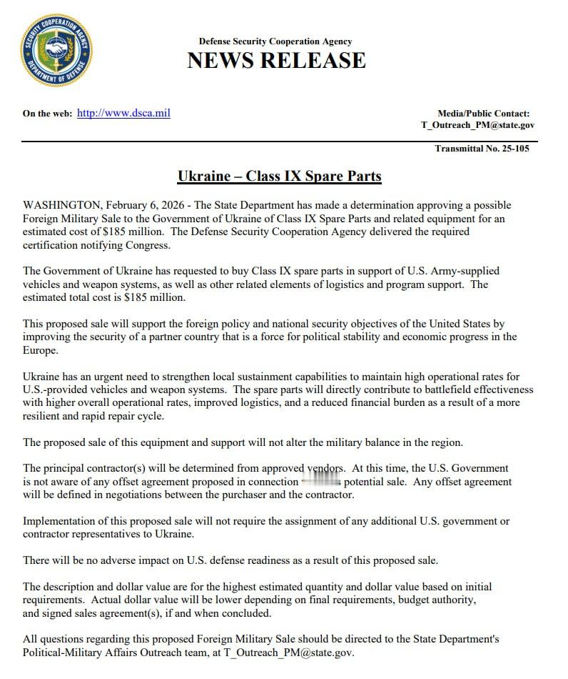 美国国务院批准可能向乌克兰出售价值约1.85亿美元的IX类备件及相关设备,作为政府间军事销售计划的一部分 — 官方声明。相关通知已通过国防安全合作局提交至国会。此次交易涉及为美国转交的车辆和武器系统提供备件,以及后勤和软件支持。华盛顿方面强调,这一决定将帮助乌克兰保持军事装备的高战备状态,加快维修进度并降低武器修复成本。美国国务院指出,这一举措符合美国外交政策和安全利益,因为它增强了在维护欧洲稳定方面发挥作用的合作伙伴的能力。此次销售不会改变该地区的军事平衡,也不会影响美国自身的战备状态。