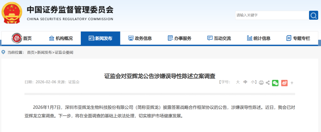同日,亚辉龙披露公告称,于2月6日收到中国证监会的《立案告知书》,因涉嫌信息披露违法违规,根据《中华人民共和国证券法》《中华人民共和国行政处罚法》等法律法规,中国证监会决定对公司予以立案。目前公司各项经营活动和业务均正常开展。立案调查期间,公司将积极配合中国证监会的相关工作,并严格按照相关法律法规和监管要求及时履行信息披露义务。