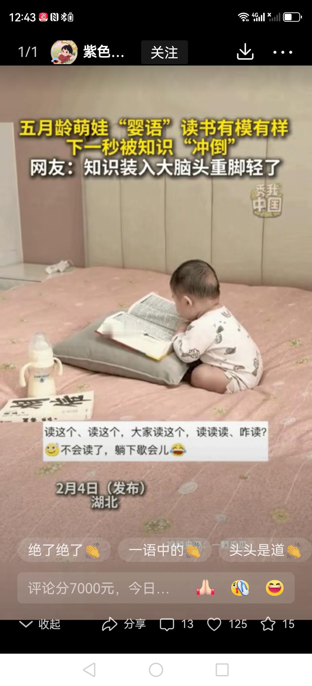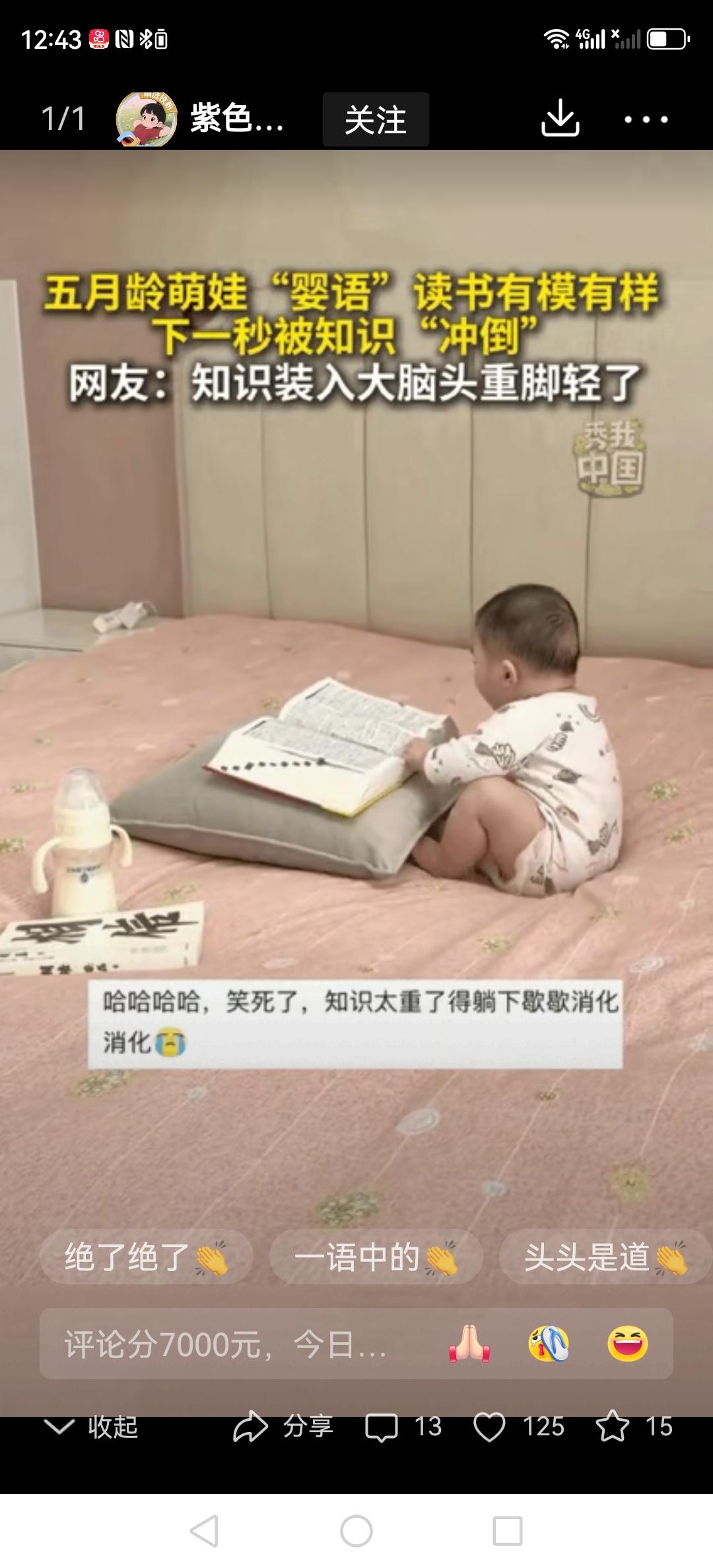 刚满五个月的小宝宝读书闹笑话了!小宝贝用“婴语”对着一本厚厚的书咿咿呀呀“念”得可认真,下一秒却突然身子一仰,整个人像只刚翻壳的小乌龟似的,肉嘟嘟的小手还在空中胡乱划拉两下,直接摔在了床上。网友们都笑坏了:“这波操作我给一百分!” 这届小宝宝也太“卷”了吧!连尿不湿都包不住他们脑子里的“知识量”,这让不少成年人看了都觉得自愧不如。视频里,这个小家伙两只小手捧着一本比他小脸还大的厚书,嘴里咿咿呀呀“念”得特别认真。可没过几秒,他突然身子一仰,整个人就像只刚翻过来的小乌龟似的,肉嘟嘟的小爪子还在空中胡乱划拉了两下,然后“啪叽”一下摔在了床上。 网友们的评论更是绝了:“尿都装不下的年纪装得下知识,装得下尿的年纪知识都漏光了!”还有人给他配了内心独白:“这本量子物理太难了,让本宝宝躺会儿...”连新华社都被萌到转发,果然啊,人类幼崽就是这世上最顶级的“治愈神器”。 现在连小宝宝都开始“内卷”读书了?不过看着他肉乎乎努力的小模样,突然觉得生活真的好治愈。你家娃有没有过让你笑到肚子痛的“翻车”时刻呀?宝宝多久说话 五个月大宝 婴儿宝宝会说话 幼儿几岁会说话 四个月宝宝嚷 小话痨婴语 4岁半宝宝读书