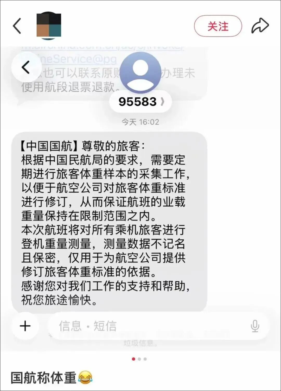 网友提供的航司短信称,据中国民航局要求,需定期进行旅客体重样本的采集工作,以便于航司对旅客体重标准进行修订,“本次航班将对所有乘机旅客进行登机重量测量,测量数据不记名且保密,仅用于为航空公司提供修订旅客体重标准的依据。”