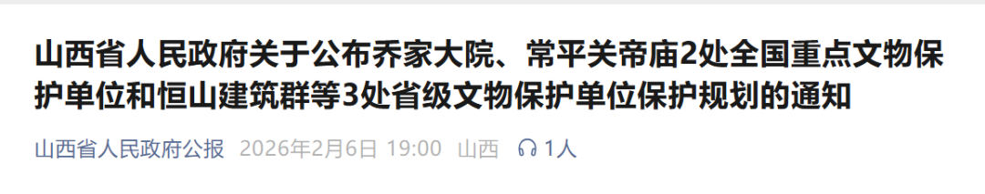 近日,山西省人民政府关于公布乔家大院、常平关帝庙2处全国重点文物保护单位和恒山建筑群等3处省级文物保护单位保护规划的通知。