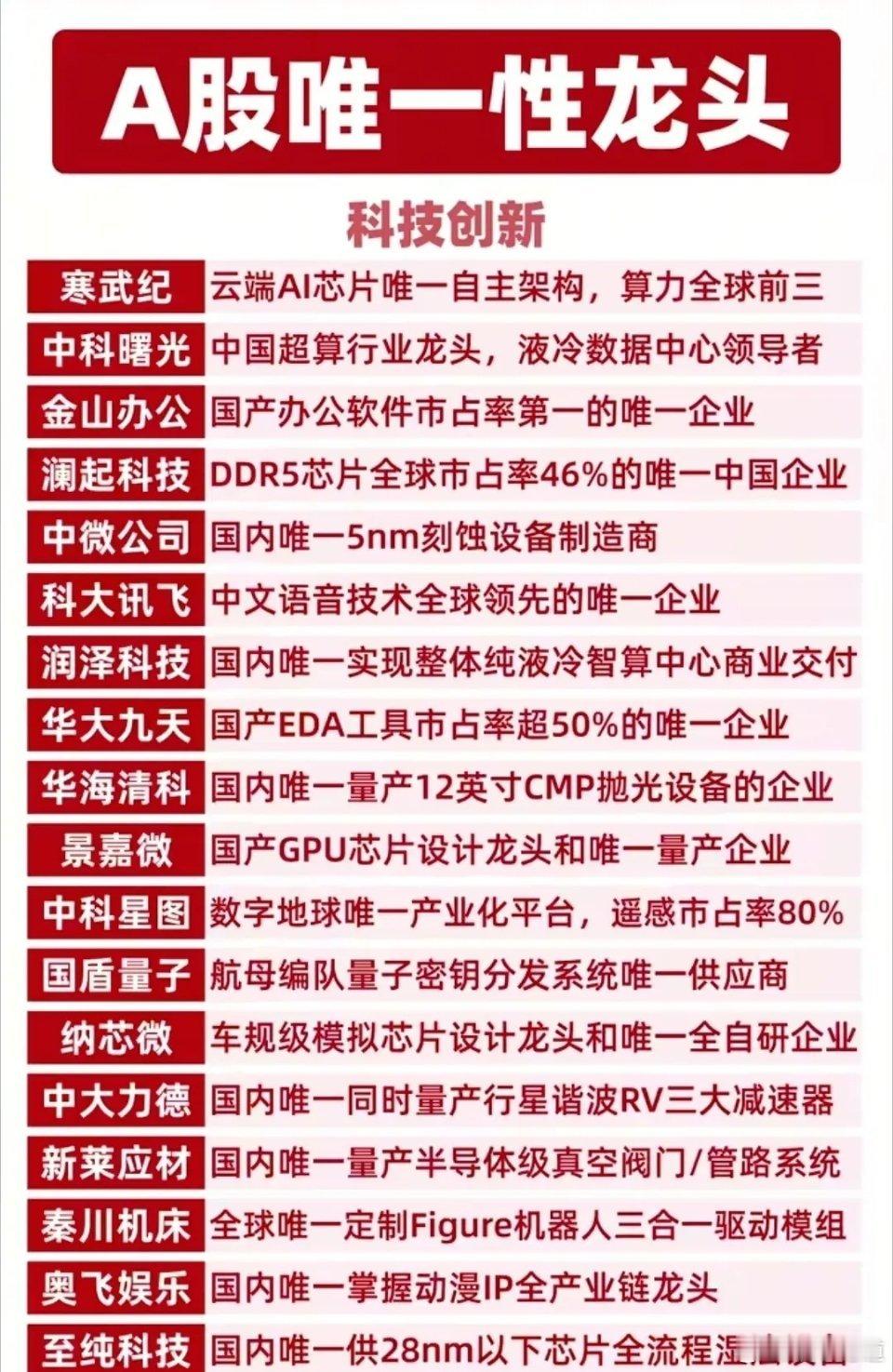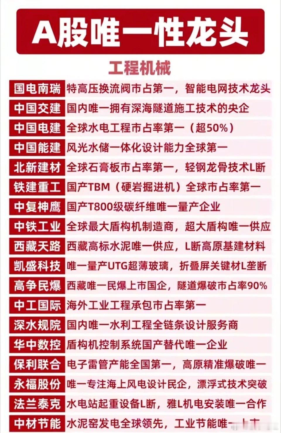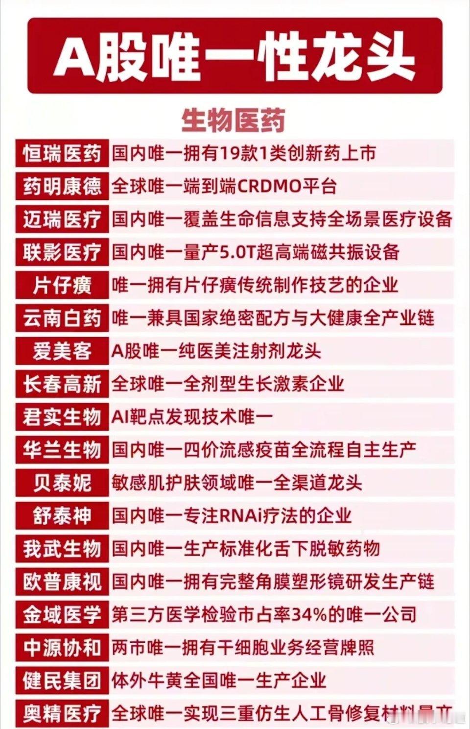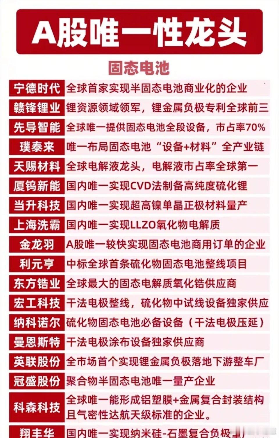 A股唯一性龙头全梳理!核心标的值得硬核收藏!这份名单涵盖能源资源、固态电池、工程机械、文娱、消费、生物医药、科技创新七大核心赛道,挖掘各领域真正具备“唯一性”的龙头企业。硬核逻辑,一眼看懂核心竞争力,赛道龙头,把握产业发展主脉络。这份名单,是你布局A股的硬核参考,建议收藏反复研究!
