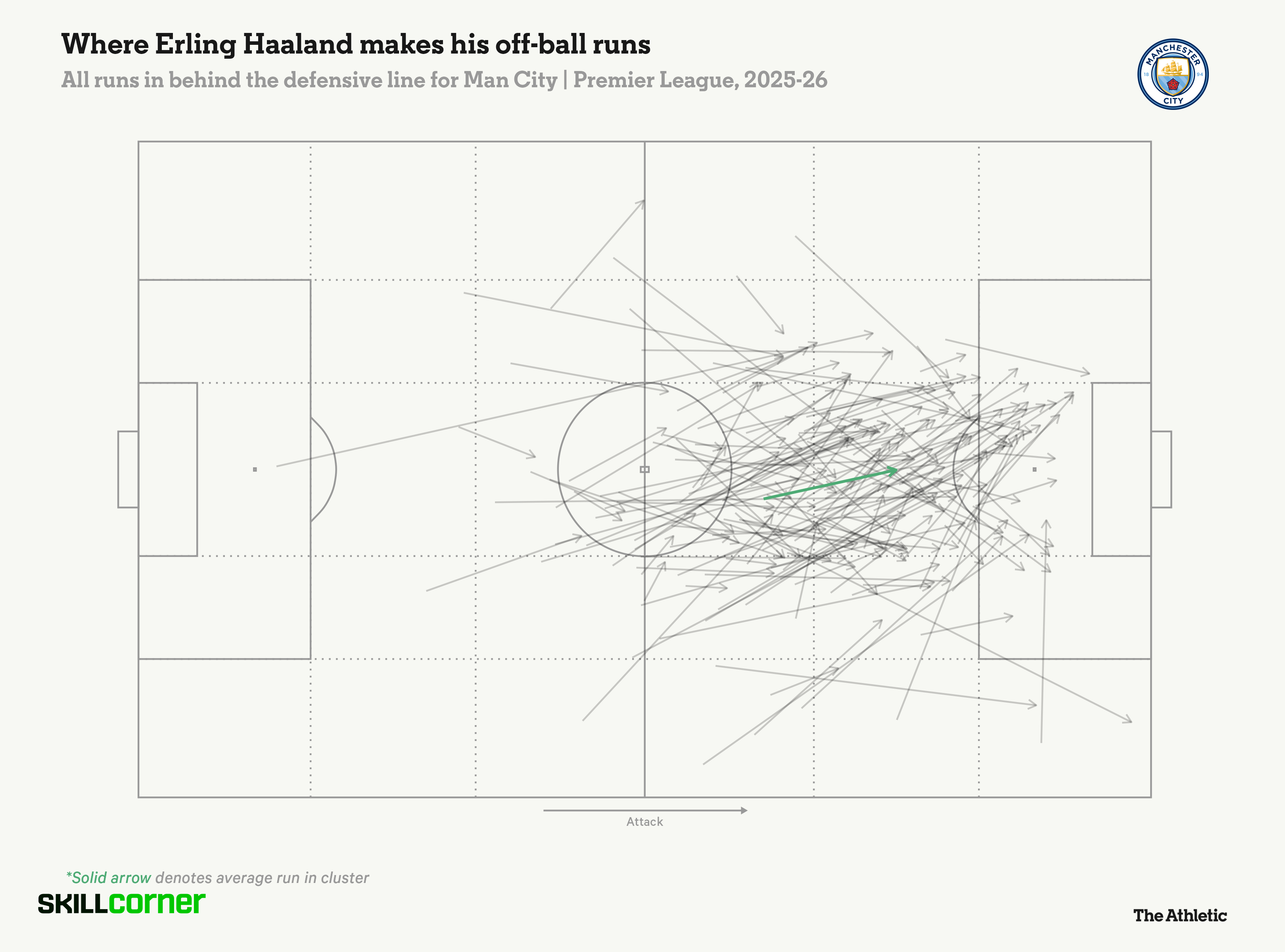 SkillCorner的数据显示,本赛季英超联赛中,所有无球跑动超过200次的中锋中,哈兰德的接球率最低(13%)。