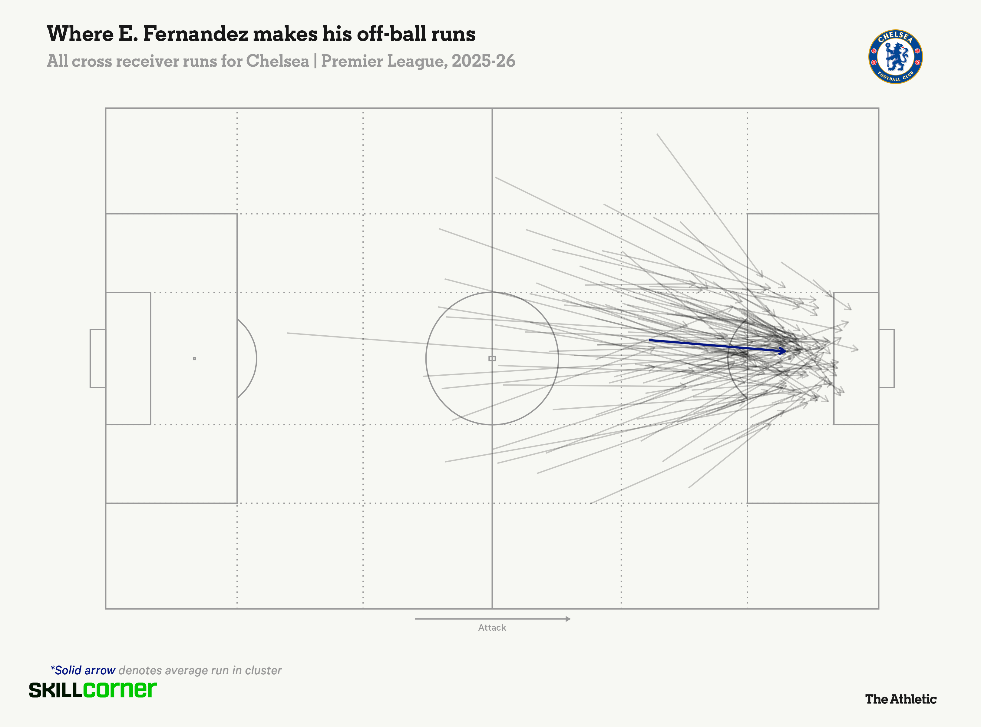 本赛季,恩佐已经完成了135次Skillcorner定义的“接应传中跑位”,也就是无球跑动到禁区附近接应传中。这一数据在切尔西队内仅次于若昂-佩德罗(162次),位列第二,这表明这位阿根廷国脚已经成为球队边路进攻时的第二得分点。