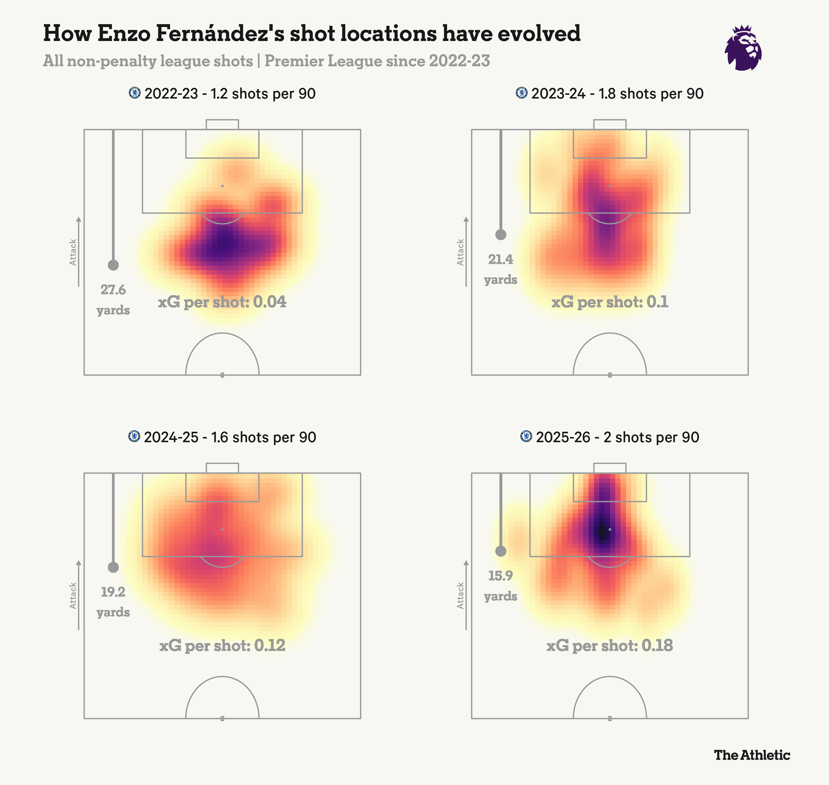 在切尔西的职业生涯中,恩佐的射门方式发生了翻天覆地的变化,平均射门距离几乎缩短了一半。这一转变始于波切蒂诺执教时期,并在马雷斯卡和罗西尼尔的执教下加速发展,这两位教练几乎都让他担任更靠前的中场角色: