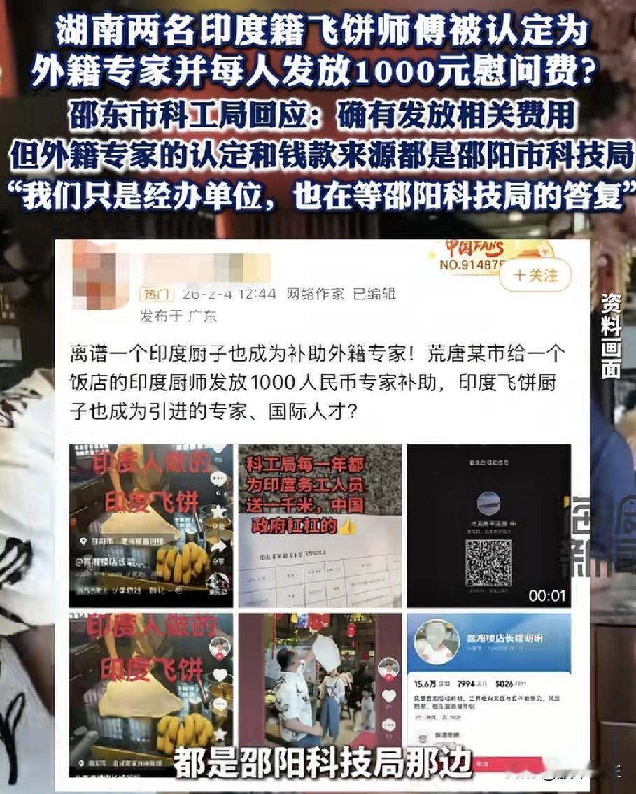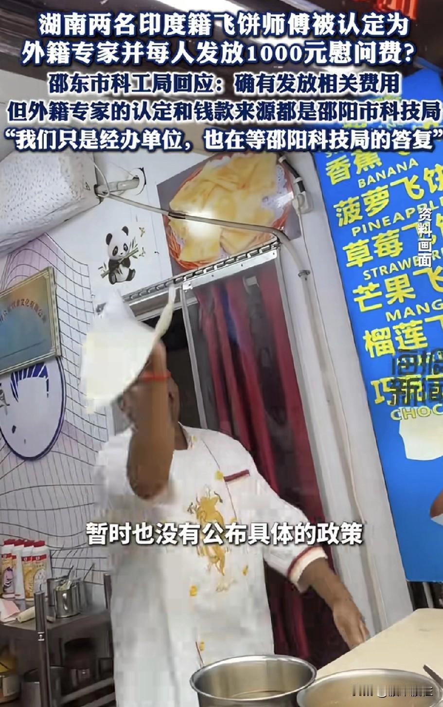 印度籍飞饼师傅火🔥了! 每人发放1000元慰问费? 两名印度人被认定为外籍专家! 邵东市科工局回应:确有发放相关费用,但外籍专家的认定和钱款来源都是邵阳市科技局。“我们只是经办单位,也在等邵阳科技局的答复”。 这样的外籍专家国内还有多少?邵阳科技局还是“慧眼识英才”的,这种只发钱不解释的做法,衙内作风还是挺正的。 大家对这种事怎么看?躺着看,还是站着看。