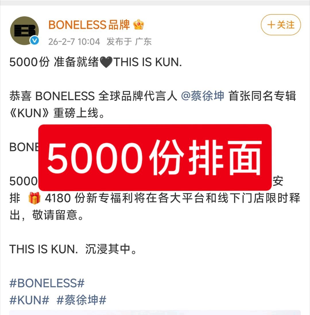 BONELESS品牌支持全球品牌代言人蔡徐坤5000份 同名专辑《KUN》!什么级别?