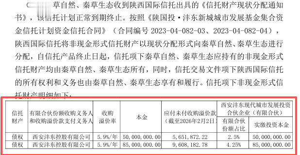 2025年10月23日,秦草生态赎回第一笔信托,收回本金6300万元和收益718.02万元。然而,截至2026年2月4日,该信托计划正常到期终止后,剩余1.35亿元本金尚未兑付,其中秦草自然未能收到本金8500万元,秦草生态未能收到本金5000万元。