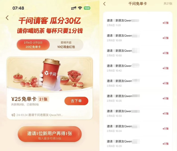 据介绍,每位用户最多可在“千问春节免单活动”中获得21张25元免单卡,其中1张为无门槛免单卡,登录即有,另外20张为成功邀请新用户后获得,总计价值525元。大额福利和趣味裂变玩法极大激发了用户参与热情,纷纷开启亲朋好友邀请模式,“拼的就是速度,现在邀请好友还相对容易,越早越好集满”,“必须成为相亲相爱家族群最先出手的那一个”。目前,已有大量网友在网上晒单表示“已集齐21张免单卡”。