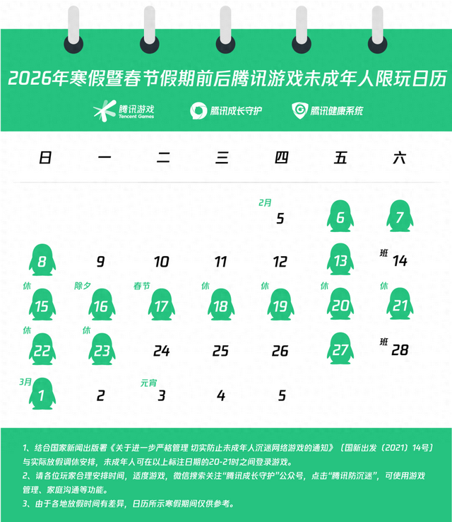 暨春节假期前后未成年人游戏限玩日历