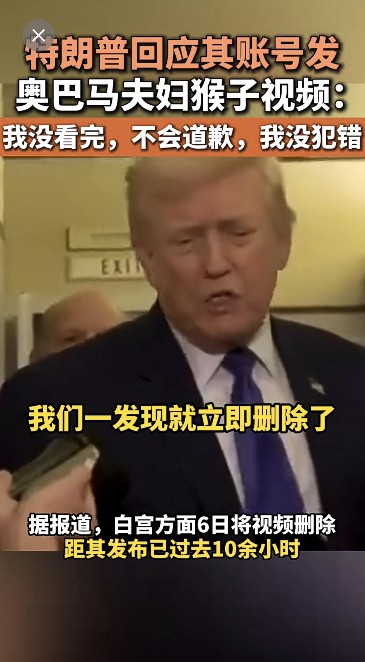 特朗普回应其账号发奥巴马夫妇猴子视频:我没看完,不会道歉,我没犯错。