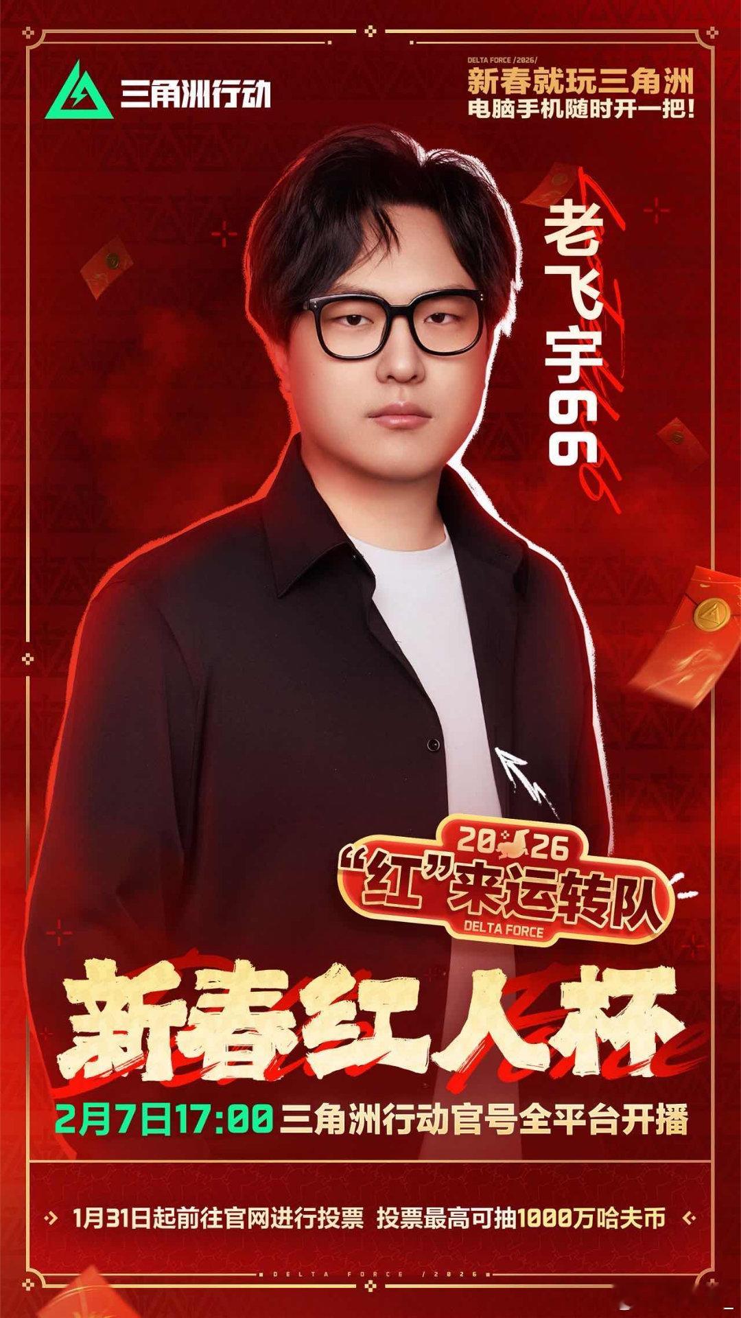 三角洲新春红人杯开打三角洲行动“红”来运转队冲!彭昱畅搭档老飞宇66和成成大王出战,拼命三郎上线战场,主打一个全力以赴,carry全场!2月7日17点,锁定直播间为彭彭战队打call!