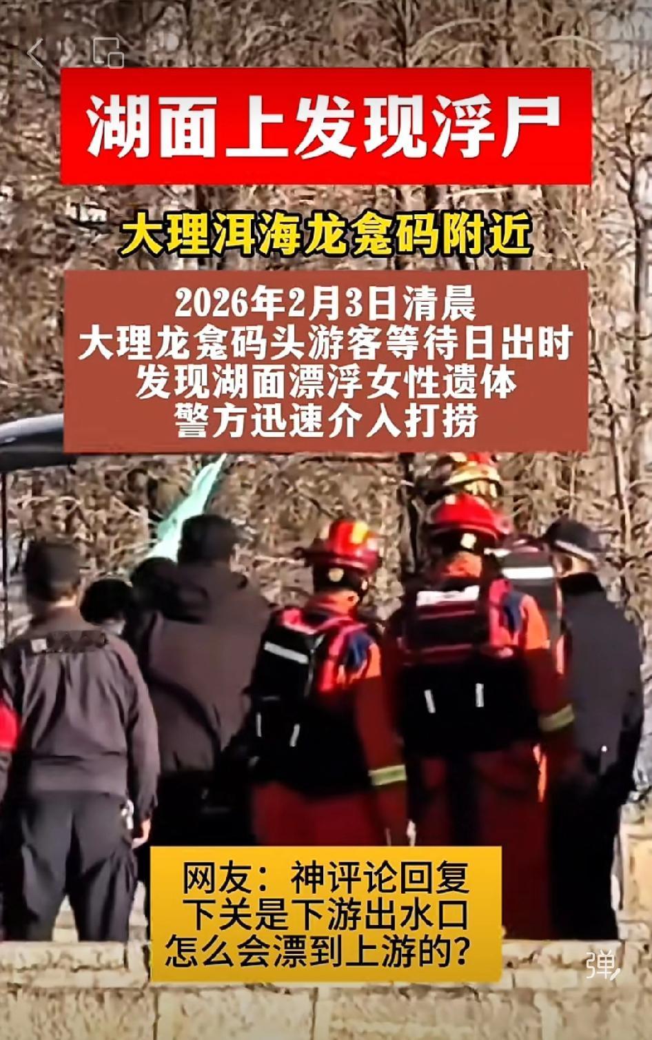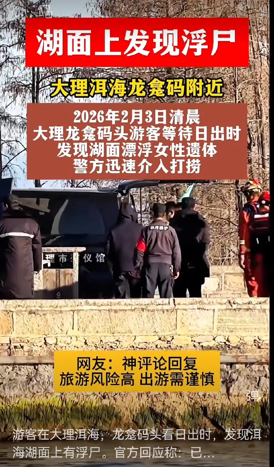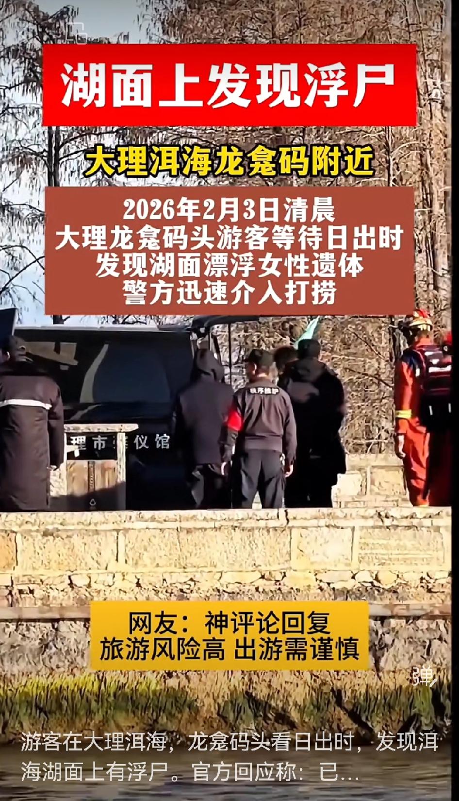 🌅近日大理洱海某码头惊现女性浮尸! 游客于大理龙龛码头观赏日出时发现!官方回应:已打捞上岸,正在调查处理… 2026年2月3日清晨,大理龙龛码头的游客在等待日出之际,发现湖面有一具女性遗体漂浮着,警方迅速介入打捞工作。事发时正值日出,金色的阳光与这一突发事件形成了强烈反差,引发了围观者对于旅行安全以及心理健康的讨论。 网民神回复:旅游风险高,出游需谨慎!具体情况,一切以官媒发布的信息为准! 消息来源于网络 爆料
