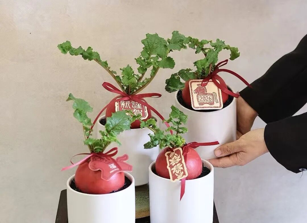 在货架和展示区,通体橙黄的五代果色泽鲜亮、果实饱满,十分契合春节喜庆氛围。深棕色的灵芝形态古朴,搭配简约素净的花盆,格调雅致,自带中式美学的韵味。胖墩墩的鸿运萝卜表皮红润,衬着翠绿的缨叶显得憨态可掬,十分吸睛。