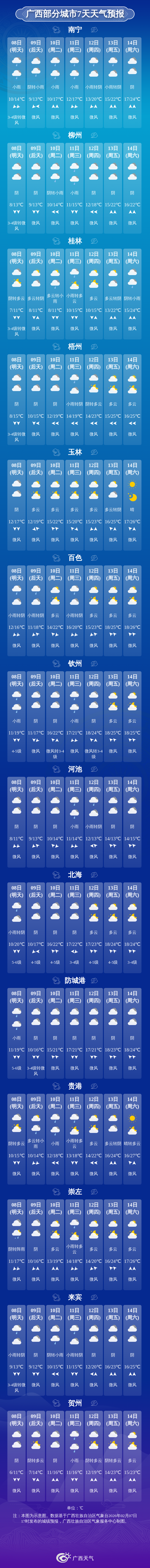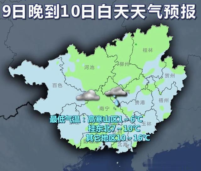 9日晚上到10日白天,全区阴天大部有小雨。最低气温:高寒山区1~6℃,桂东北7~10℃,其它地区10~16℃。