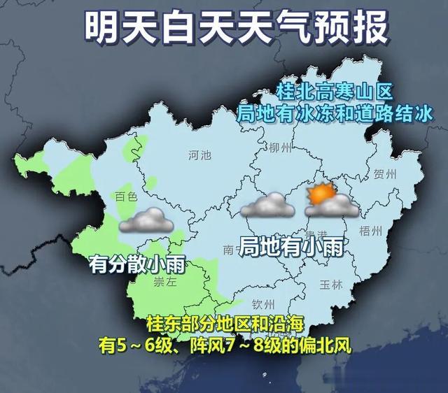 8日晚上到9日白天,桂北、桂西阴天有分散小雨,其它地区阴天、局地有小雨。桂北高寒山区局地有冰冻和道路结冰。沿海地区有5~6级、阵风7级的偏北风。最低气温:高寒山区-2~4℃,桂东北5~8℃,其它地区8~14℃。