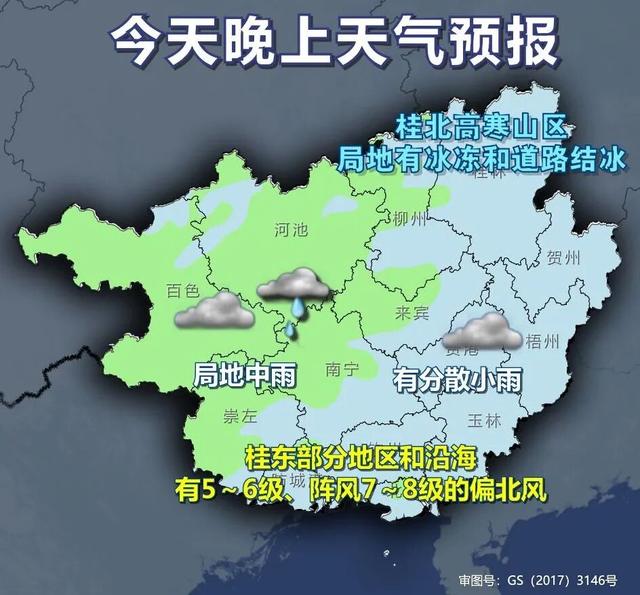 今天晚上,百色、河池、柳州、崇左、南宁等市阴天有小雨、局地中雨,其它地区阴天有分散小雨。