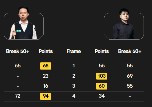 首局肖国栋打出单杆65分完成单局逆转,随后赵心童打出单杆69分和55分连下两城,第四局肖国栋打出单杆72分获胜。