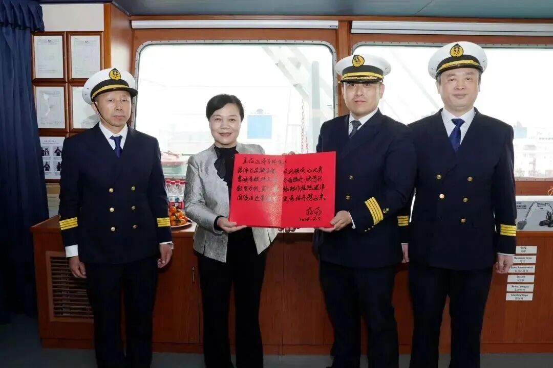 交付仪式上,“中远海运牡丹”轮教母、徐工集团国际事业总部党委副书记/纪委书记/工会主席蒋南女士专程回访,参观改造关键区域,高度肯定项目团队攻坚克难的成果,并以跨越七年的祝福为“中远海运牡丹”轮新征程赋能。仪式后,中远海运集运及上海中远海运重工相关领导与部门负责人慰问全体船员,鼓励团队以更高标准保障船舶安全与绿色运营。