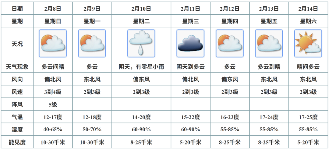预计,8-9日多云间晴,天气较冷;10日起冷空气影响减弱,10-12日阴天到多云,初时有零星小雨,13-14日多云到晴,气温逐日回升。天气变化节奏快,请注意适时添减衣物。近期干燥少雨,请注意用火用电安全。