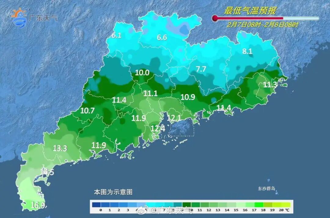 后天(2月9日),广东不少市县的最低气温要跌至10℃以下,粤北、珠三角北部最低气温将只有3℃~7℃,高海拔山区1℃~3℃。