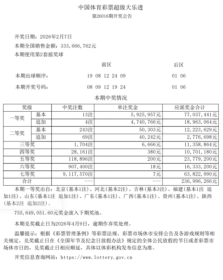 大皖新闻讯2月7日晚,中国体育彩票超级大乐透第26016期开奖公告发布,当期开出13注一等奖。