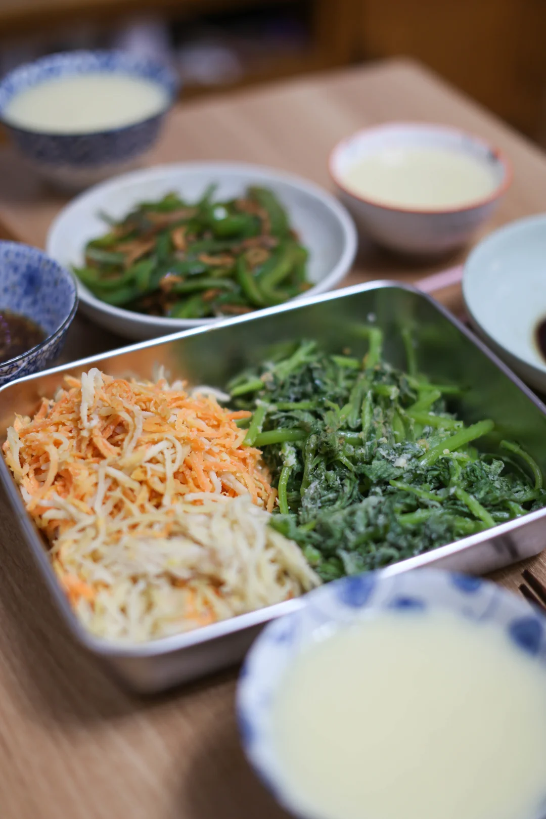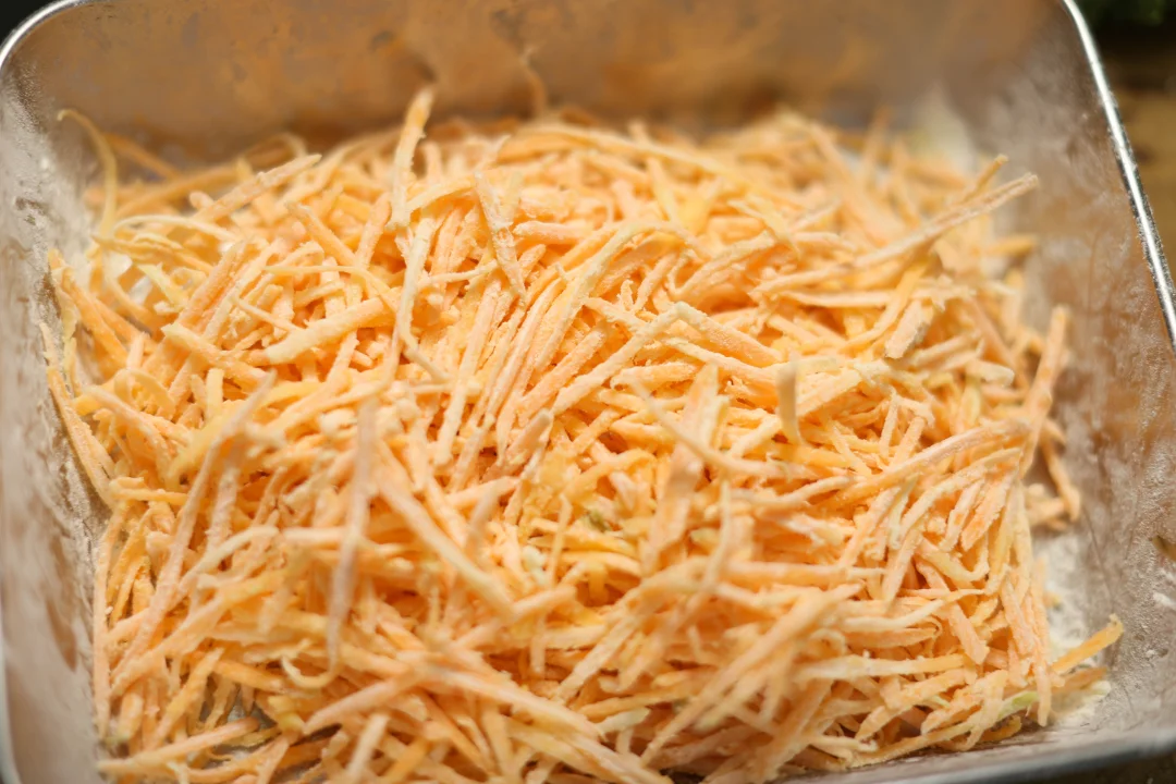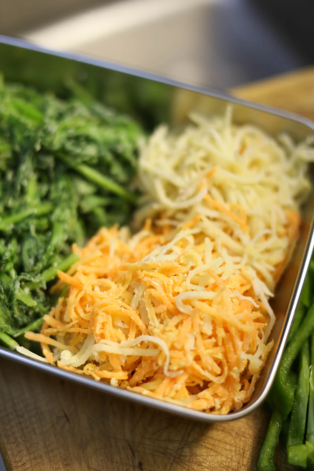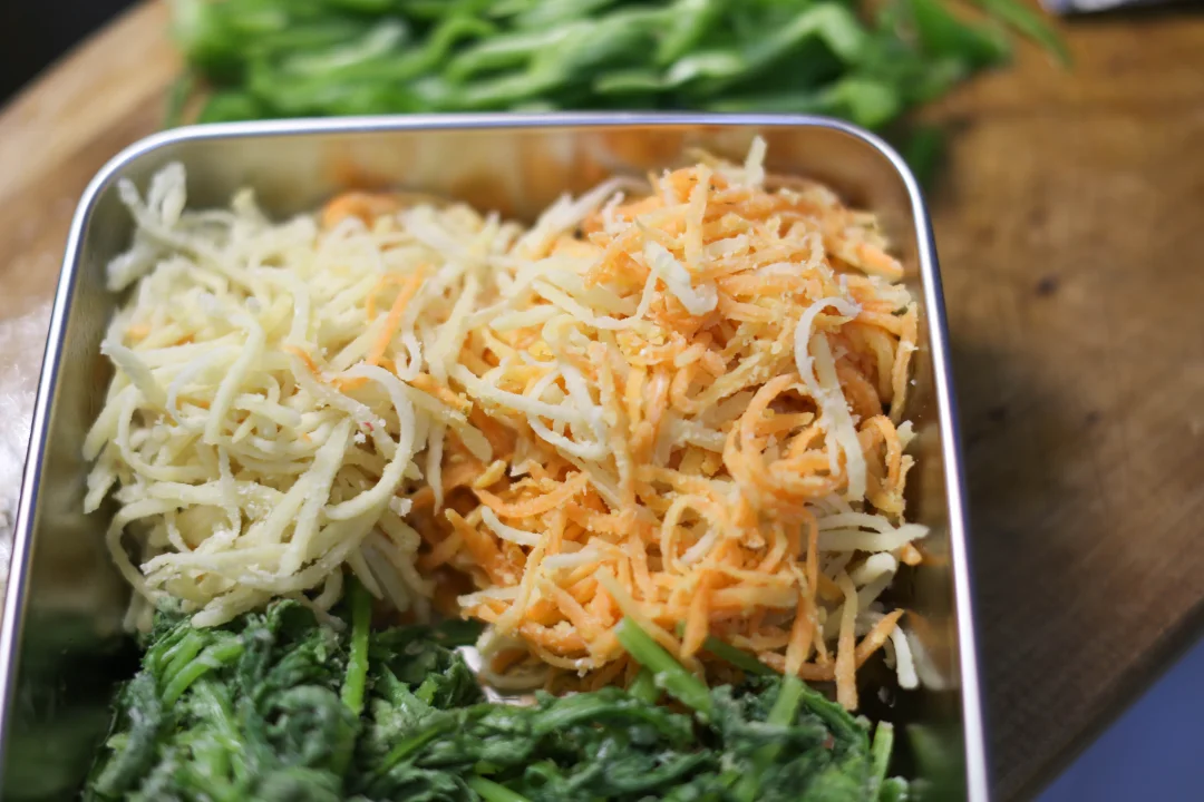 萝卜、土豆擦成丝,茼蒿切段。如果用白萝卜,记得用清水把萝卜清洗一下,可以去掉白萝卜的辣气味道。把擦好的土豆丝和胡萝卜丝放入容器中,加入一点面,让每一根萝卜丝都均匀粘上面粉,加入一点葱油,味道会更加香。
