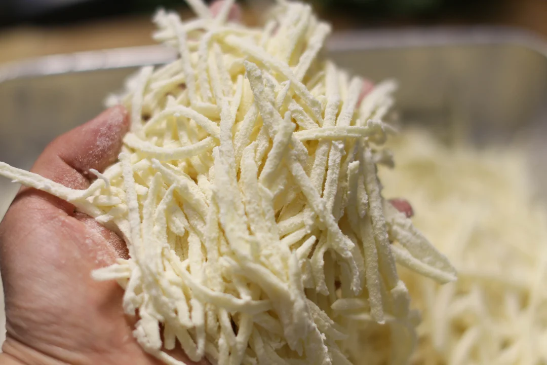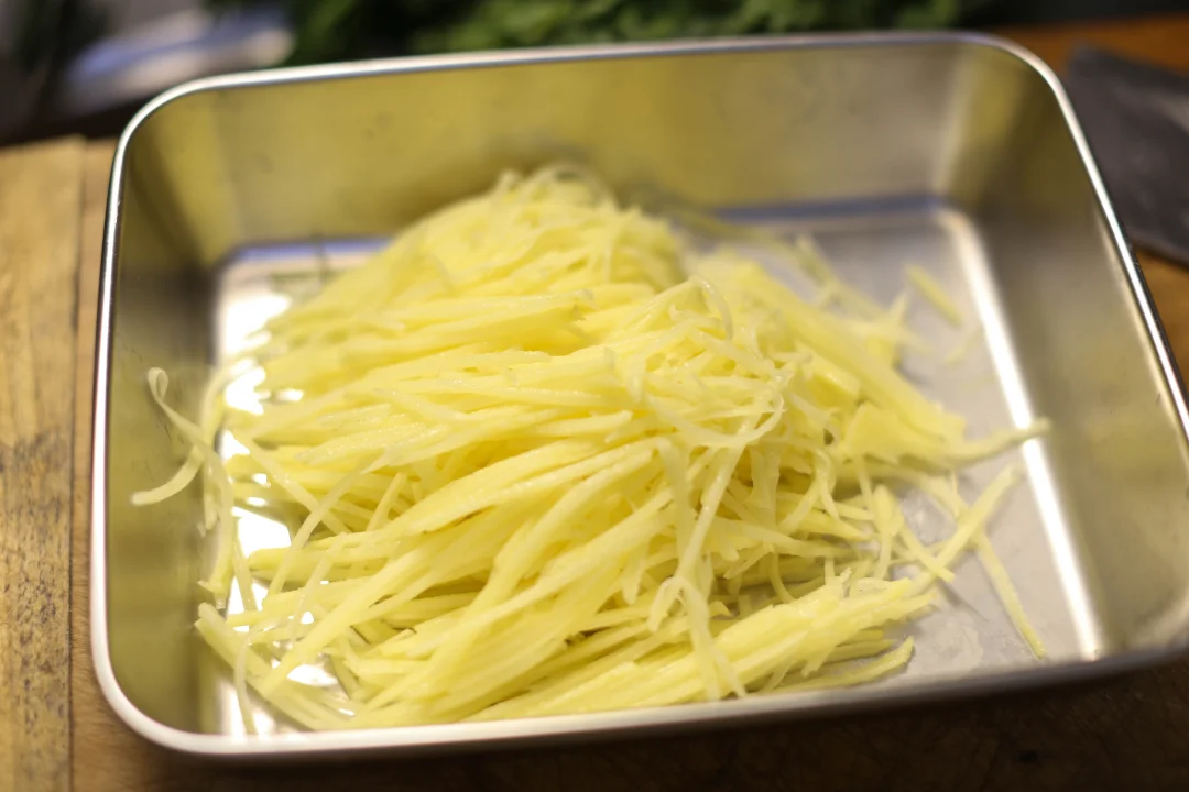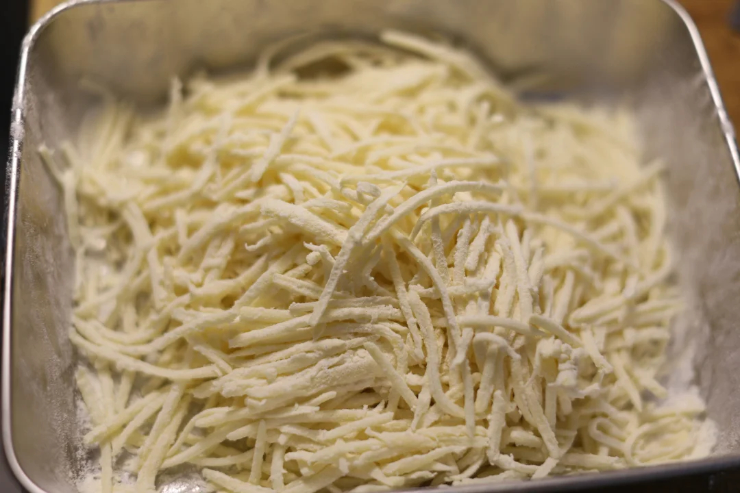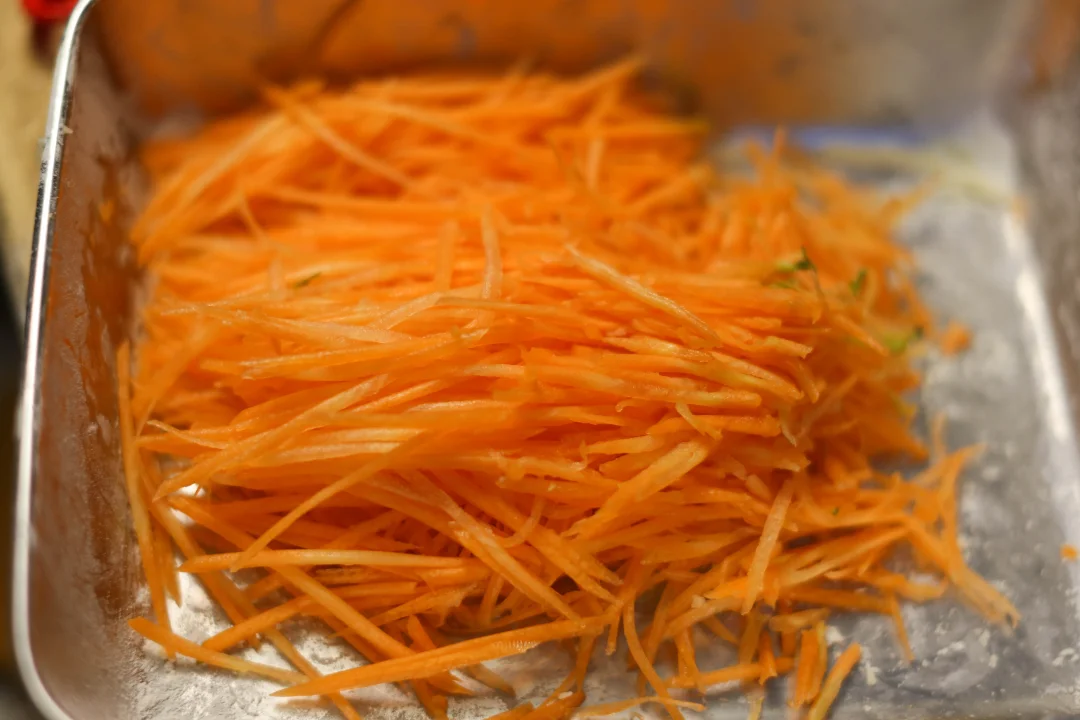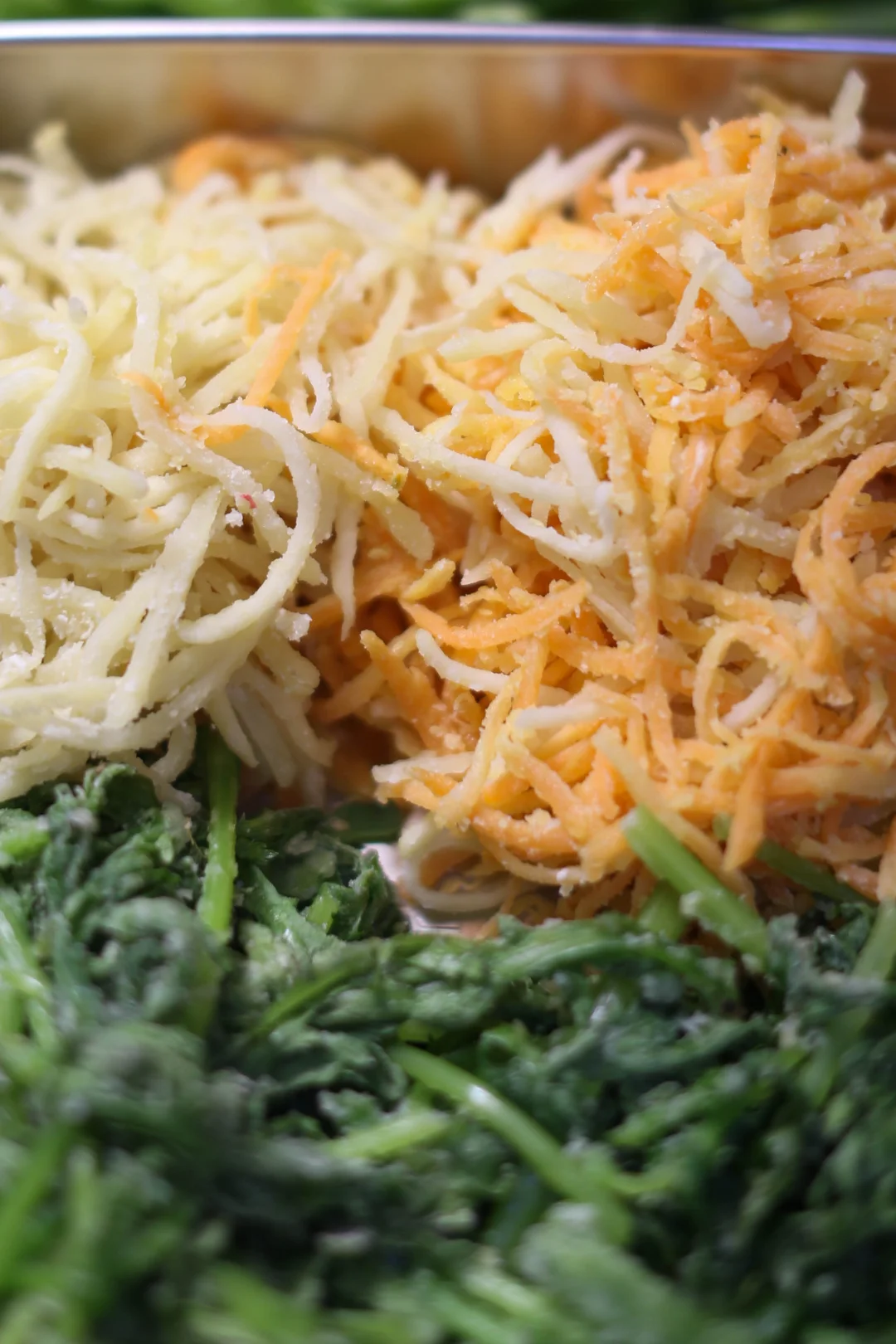 萝卜、土豆擦成丝,茼蒿切段。如果用白萝卜,记得用清水把萝卜清洗一下,可以去掉白萝卜的辣气味道。把擦好的土豆丝和胡萝卜丝放入容器中,加入一点面,让每一根萝卜丝都均匀粘上面粉,加入一点葱油,味道会更加香。