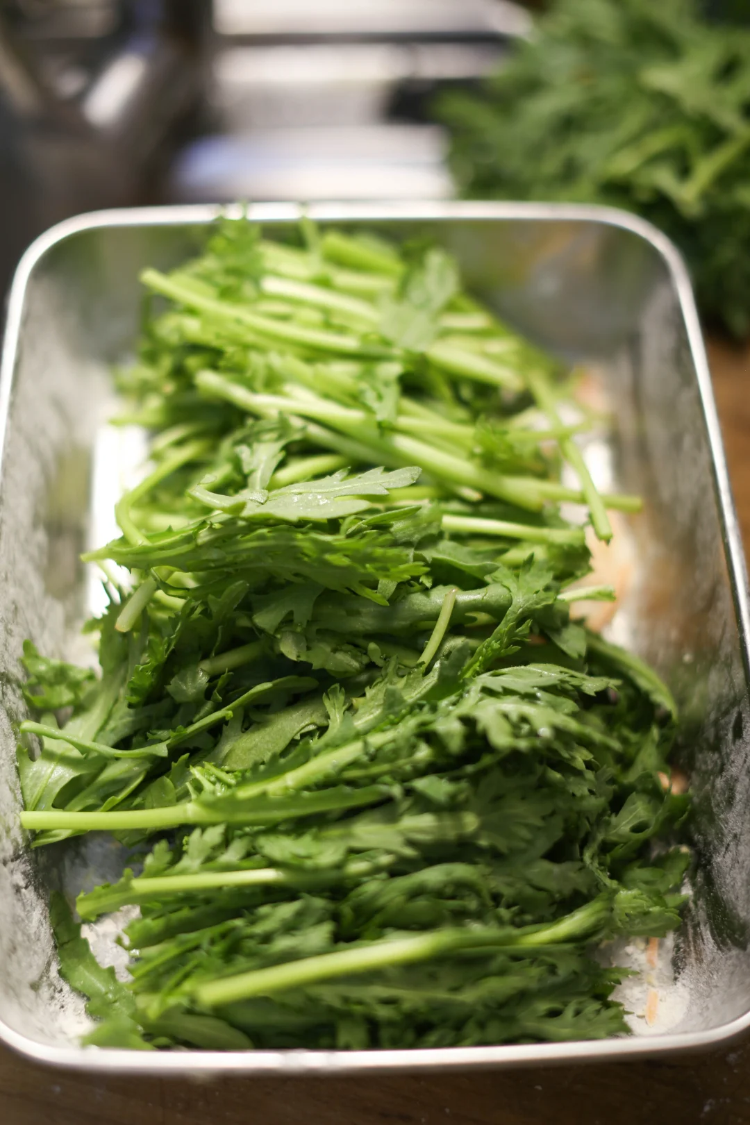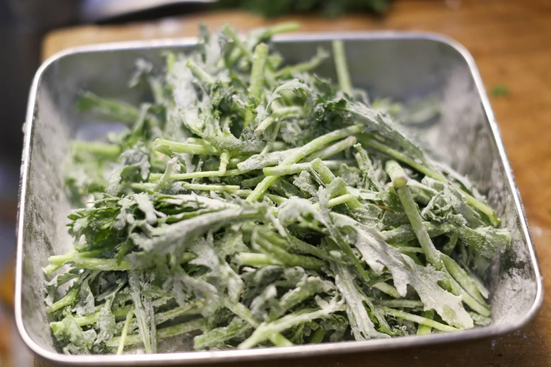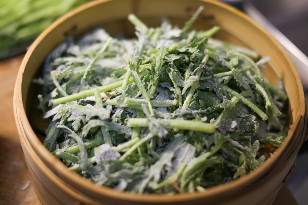 大街上买回来的茼蒿头,看着特别嫩,于是就想到了蒸菜。
