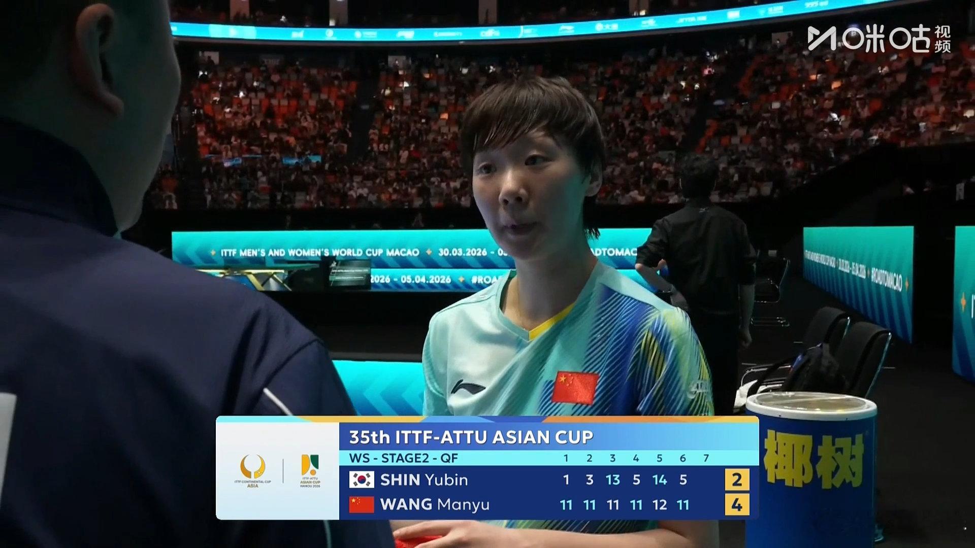 海口亚洲杯女单1/4决赛,王曼昱4-2战胜申裕斌,晋级四强。比分:11-1、11-3、11-13、11-5、12-14、11-5。王曼昱将在半决赛对阵张本美和。