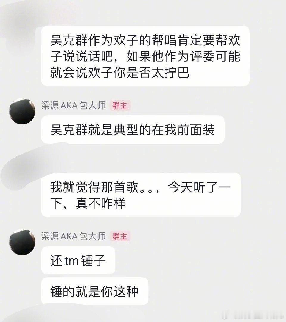 梁源在粉丝群蛐蛐吴克群有歌第二季 这波争议真是“信息茧房”的典型案例!梁源一句“不做音乐了”的评价,和吴克群新歌不停、合作不断、积极尝试AI与竖屏MV、默默扶持新人的实际行动,形成了鲜明对比。音乐人的努力,不该被片面评价轻易抹杀。