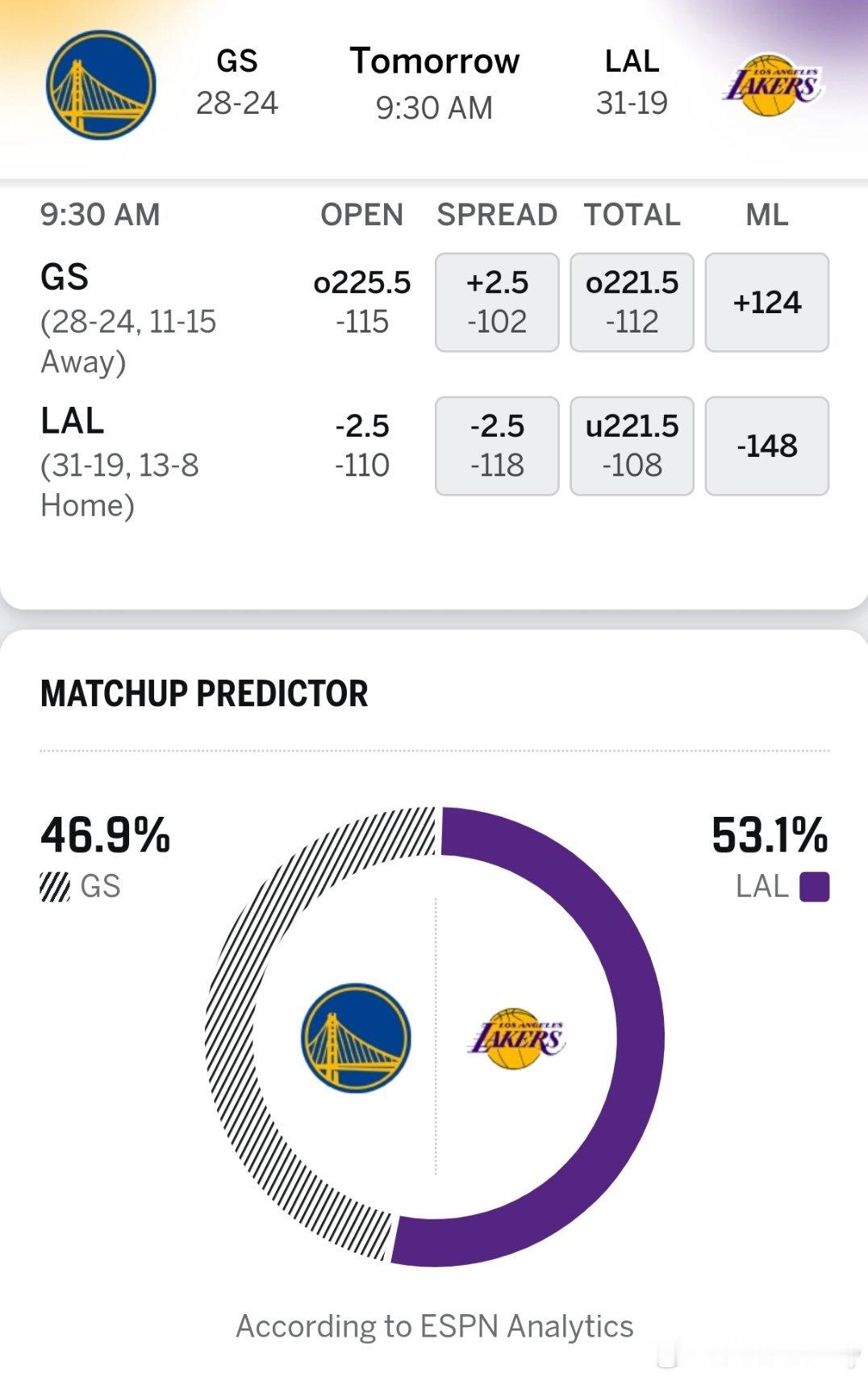 ESPN预测双方胜率:勇士46.9%,湖人53.1%,湖人-2.5分