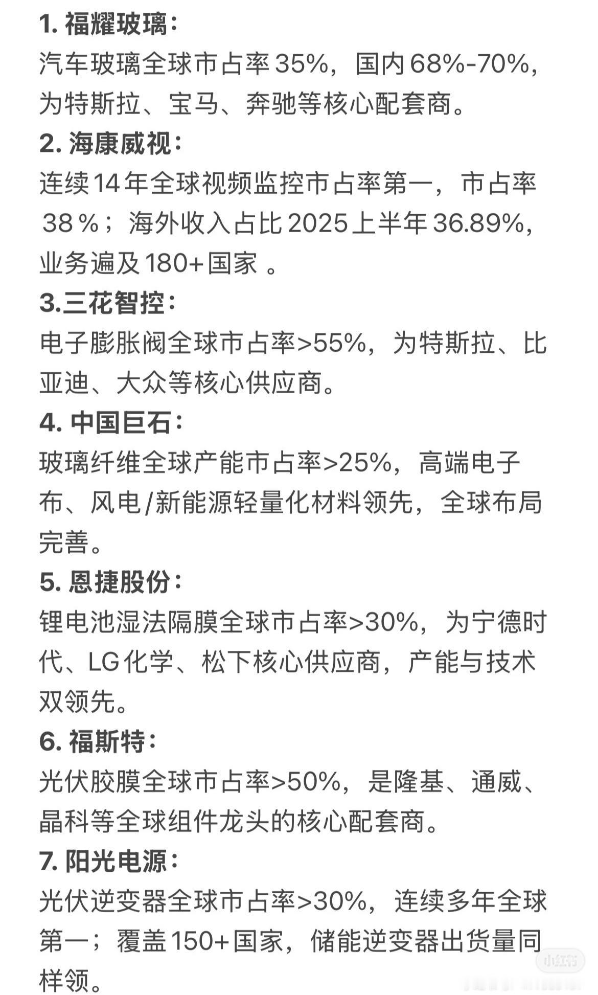 十家在全球市场占据显著份额的中国企业及其领先地位。 企业名单及核心数据: 福耀玻璃:汽车玻璃全球市占率35%(国内68%),为特斯拉、宝马、奔驰等核心配套商。 海康威视:连续14年全球视频监控市占率第一(38%),2025上半年海外收入占比36.89%,业务遍及180+国家。 三花智控:电子膨胀阀全球市占率>55%,为特斯拉、比亚迪、大众等核心供应商。 中国巨石:玻璃纤维全球产能市占率>25%,高端电子布、风电/新能源轻量化材料领先,全球布局完善。 恩捷股份:锂电池湿法隔膜全球市占率>30%,为宁德时代、LG化学、松下核心供应商,产能与技术双领先。 福斯特:光伏胶膜全球市占率>50%,是隆基、通威、晶科等全球组件龙头的核心配套商。 阳光电源:光伏逆变器全球市占率>30%,连续多年全球第一;覆盖150+国家,储能逆变器出货量领先。 晶盛机电:8英寸半导体硅片长晶设备全球市占率>60%,光伏/蓝宝石长晶设备市占率同样领先,为中芯国际、隆基等核心设备商。 宁德时代:动力电池全球市占率超30%(2025年),连续多年位居全球第一。 比亚迪:新能源汽车销量全球第一,DM-i混动与刀片电池技术领先,海外市场销量高速增长。 这些企业均为各自领域的全球核心供应商或领导者,服务国际知名客户,并在全球市场占据显著份额。