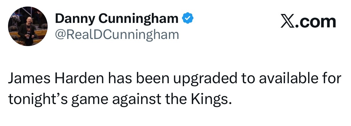 哈登状态升级,迎来骑士首秀,出战国王。