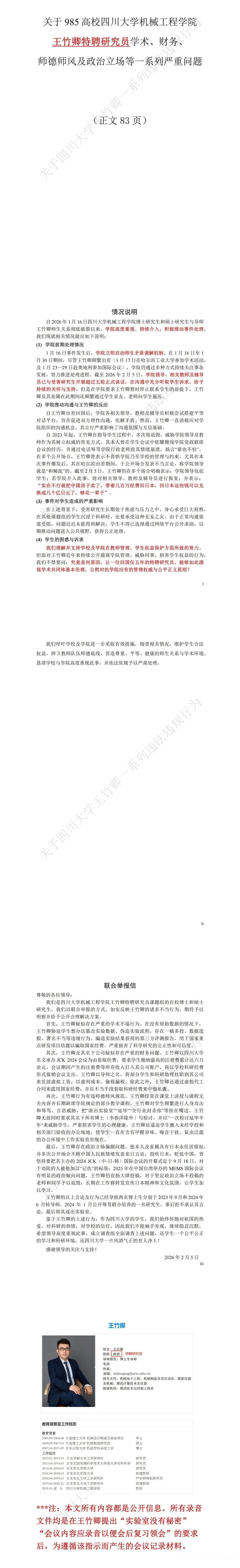 四川大学的王竹卿可不能开除就完事了! 这样的人应该永远留在四川。 13年的日本学习和工作经历,口罩期间回国工作,经常在国内外以学术交流的名义出差,辱骂同事、威胁学校、恐吓学生…… 这些看的头皮发麻,这到底是一个多么张狂的人,不但不把学生和同事放在眼里,更是把学校当成自己捞金的金库。 现在看来,这厮应该不止是师德师风败坏、人品有问题吧,他那些言论的基础,有没有涉及到反华的东西? 很多人猜测他是在日本混不下去了,或者是受什么人指使来中国的,当然他的动机和目的,相信国安一定会查清楚的。 现在要做的,就是不能让他卷着几百万经费逃回日本,他既然敢公开这样说,肯定是早就有这样的想法了,甚至都已经计划好了吧。 一个无视学校规章制度和国家法纪的人,如果涉及到了违法乱纪,甚至是危害国家安全,绝不能只是开除,不然卷钱跑回日本,将有可能变成石平二号,不但要公开辱骂自己的同胞,还要配合那些人玩政治阴谋。 这样的人当初又是如何被引进的?又是谁推荐的?通过什么渠道进来的? 这些都应该还公众一个真相,希望四川大学不要让公众失望,不要丢了川军的魂和精气神! 大刀是时候拿出来擦一擦了!