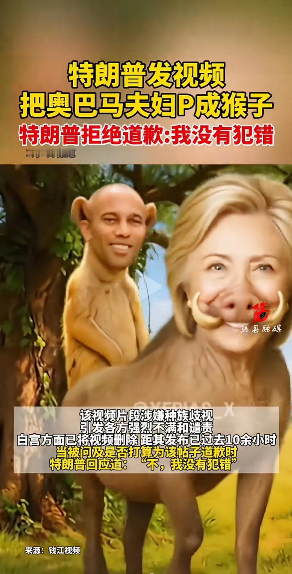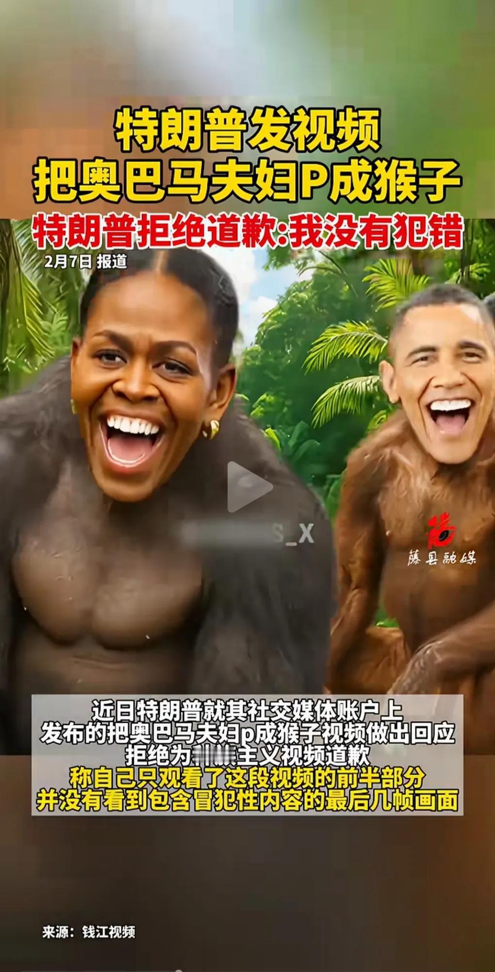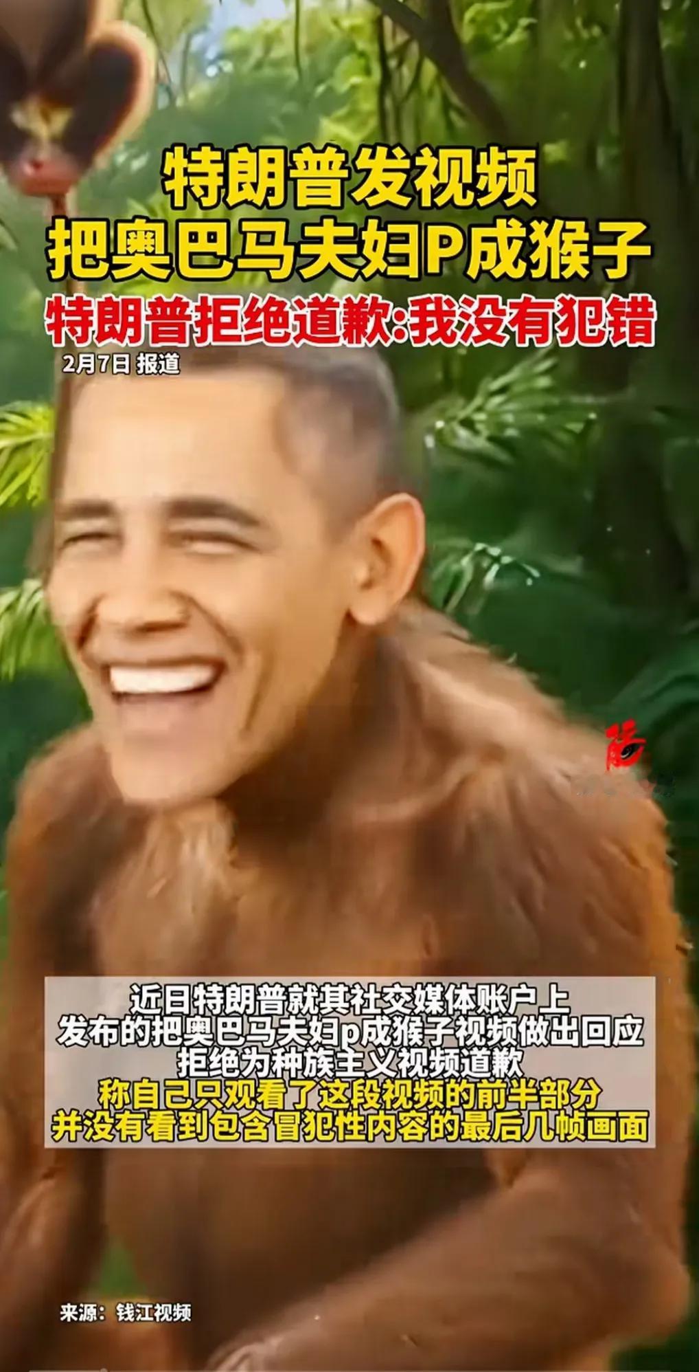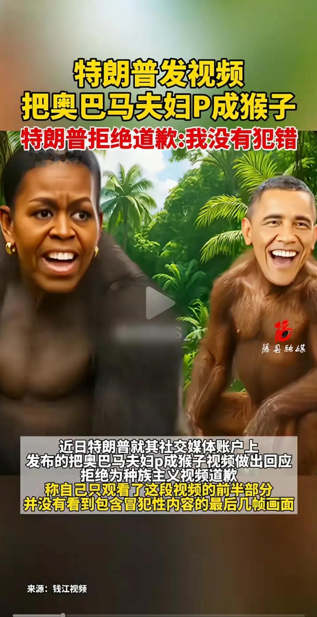 特朗普把奥巴马夫妻俩P成猴子,做成视频发在社交媒体上。 这么高身份的人,竟然做出