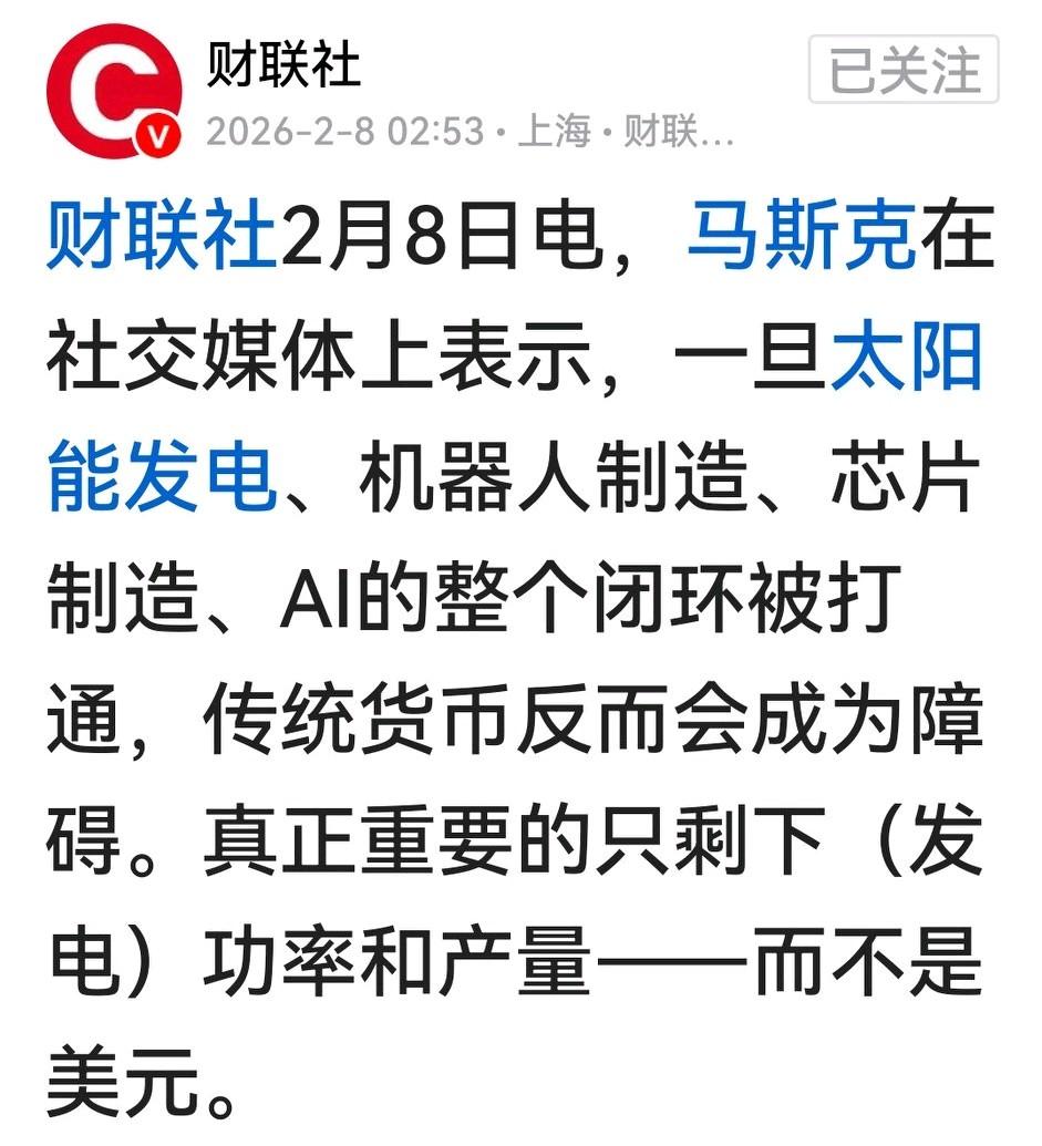 马斯克最新表示,太阳能发电、机器人制造、芯片制造、AI闭环打通,传统货币将成为障碍,真正重要的只剩下发电而不是美元。 表面看,老马是在推光伏发电,但我怀疑他也可能是想推虚拟货币,毕竟去美元化潮流不可逆转、而比特币价格从高点下来已接近腰斩。 就光伏而言,我国并不缺电,所以光伏行业仍在内卷,当下巨亏的企业仍是一大片。当然,若储能跟上了,我风电光电为代表的新能源代替化石能源仍有广阔空间,而氢能和可控核聚变还能给人们带来更大想象空间,我们炒股一族也不一定都听老马喊。