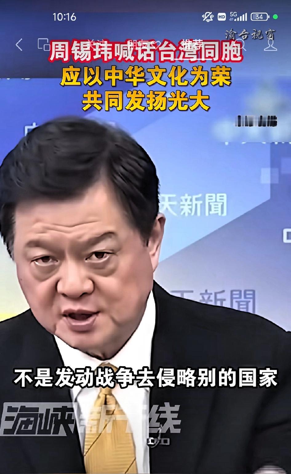 周锡玮:台湾同胞应以中华文化为荣,发扬光大。 中国大陆过去这么多年来,他辛苦努力要做的是什么?不是发动战争去侵略别的国家;不是羞辱歧视其他国家;不是任由贫困落后的国家继续衰落下去。 他走的是带给大家世界大同,世界和平,大家通通一起往上。我觉得所有台湾人应该感到很骄傲,因为我们所受到的教育完全是来自于中国人的文化和道德精神,也是中国人的传统伦理精神。现在是我们发扬光大的时候。