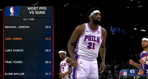 根据官方数据统计:面对太阳历史场均得分最高的球员,第一位是迈克尔-乔丹,场均32.4分;第二位是乔尔-恩比德,场均31分。