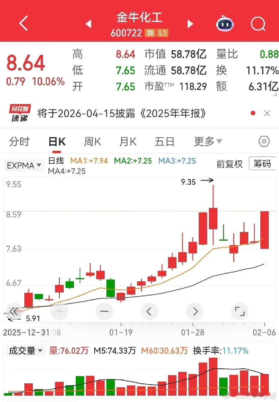 2月4日,金牛化工收出笑脸形态,与红肥绿瘦形成信号共振,我第一时间分享了这个关注点。当时还有朋友说“板块不行涨不起来”,结果话音未落,周五直接涨停,时至今日,十五天十四阳,妥妥的红肥绿瘦完美走势。
