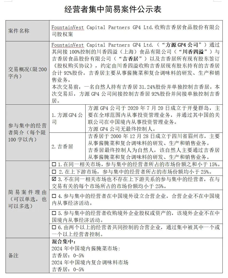 最近,根据一则经营者集中简易案件的公示显示,非常擅长私募股权投资的方源资本,将会收购有着中国泡菜之王之称的吉香居的92%股权。此消息一出,引发了不小震动。