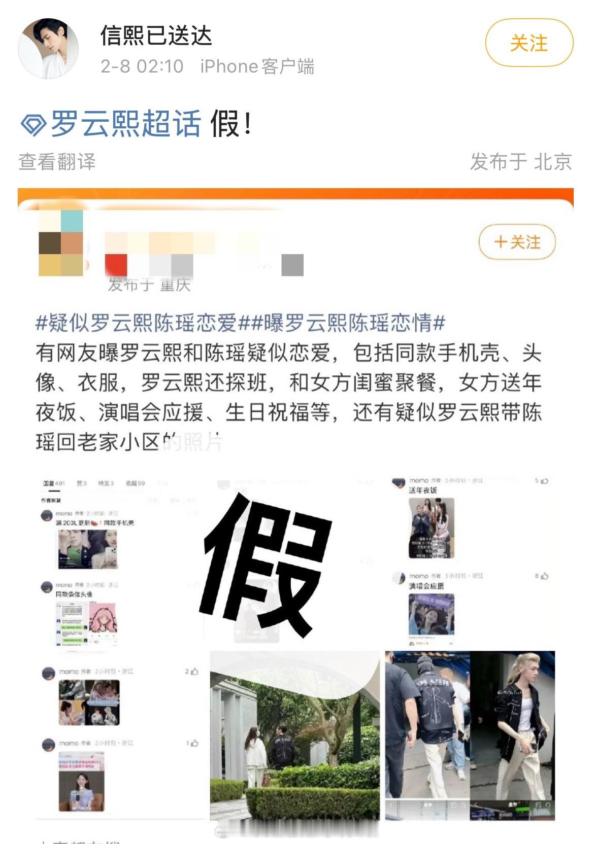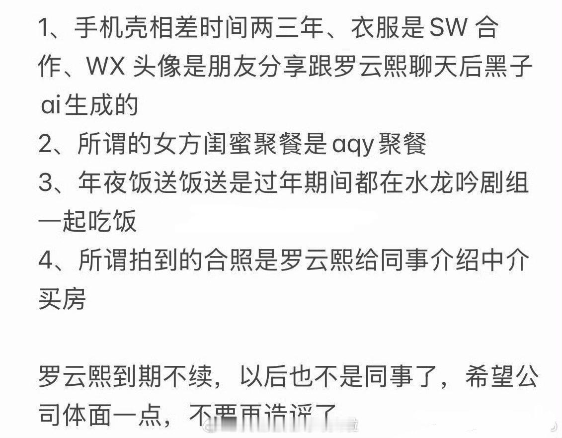 罗云熙方连夜发文说绯闻是假的,粉丝整理了针对照片的各项澄清:手机壳相差两三年、同款衣服是推广、微信头像是嘿子ai生成、女方闺蜜聚会是aqy的聚餐、年夜饭送饭是过年时都在剧组一起吃饭。拍到的合照是罗云熙给同事介绍中介买房。罗云熙陈瑶恋情 罗云熙陈瑶是同个公司的