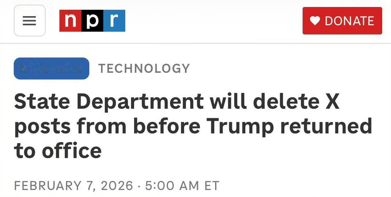 据美国国家公共广播电台,美国国务院的所有X账号,将删除阿川这次上台前的所有帖子。 包括美国驻各国使馆领馆,国务院下属单位,国务院附属或区域性账户。2月20日前完成。 现在删掉特朗普上台前的社交平台内容,就是新政府想重新打造外交上的说法,把之前和现在政策对着的表态都清掉。特朗普第一次当总统时就这么干过,比如2021年国会山事件后,就删过他的帖、封过他的社交账号。 所以要翻美国驻华大使馆旧账的,也得赶紧保存了。
