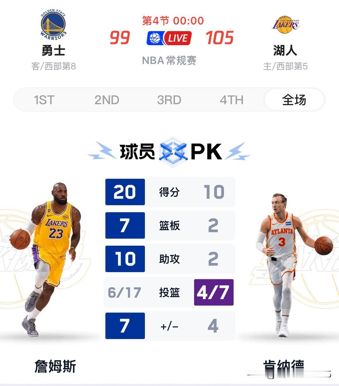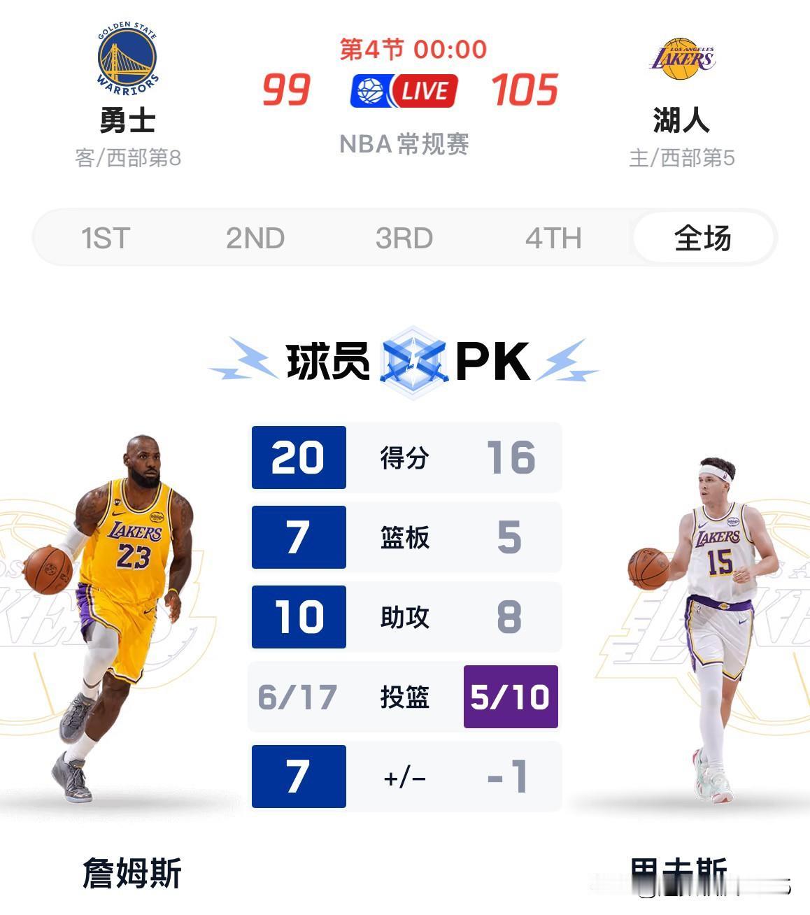 肯纳德完成首秀,詹姆斯砍下20分10助攻7篮板,湖人105:99战胜勇士,战绩与火箭持平同为32胜19负,与掘金只有一个胜场差。 上半场双方展开打铁和失误的比拼,进攻效率惨不忍睹,第一节勇士21:20领先1分,第二节21:21战平,看半场比分还以为是一节比赛。第三节开赛詹姆斯连续三次进攻拉开比分,八村也屡屡得手,湖人最多领先到12分,第四节勇士追到只差1分,里夫斯终于苏醒,几次篮下杂耍般的进攻稳定住局势,最终湖人105:99战胜勇士,战绩为32胜19负与火箭持平。 今天是里夫斯伤缺19场后的第二场比赛,虽进攻效率不及上场打76人,但全场送出了最多的8次助攻,用另一种方式帮助湖人战胜勇士。 双方都有主要球员伤缺,这场比赛并不能体现双方的真正实力,但交易后的勇士已无欲无求,反而湖人誓要打造一支联盟进攻强队,肯纳德的首秀是及格的,三分球4投2中,全场比赛砍下10分,俨然替补席上一位重要的得分手。 湖人和勇士都是中国球迷喜欢的球队,加油吧!
